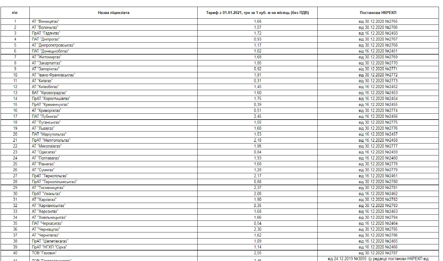 Отмечается, что тарифы повышены для 43 газораспределительных компаний и указаны без учета налога на добавленную стоимость 20%. Средняя стоимость тарифов операторов газораспределительных сетей составляет 1,53 грн за куб. м. Самая низкая цена у "Киевгаза" - 0,31 грн за куб. м, а самая высокая - у компании "Газовик", потребители которой заплатят 2,55 грн за куб. м, и у компании "Лубныгаз" - 2,45 грн за куб. м.