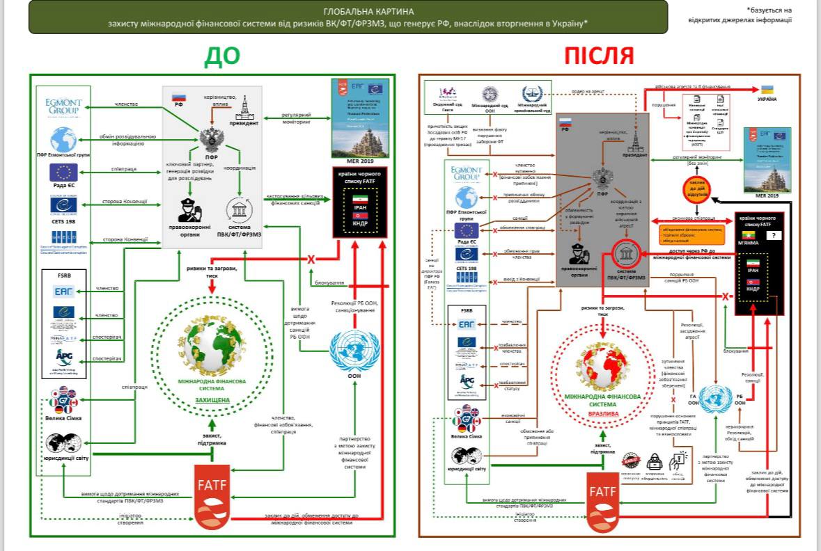 Госфинмониторингом, среди прочего, подготовлена визуализация «Глобальная картина защиты международной финансовой системы от рисков генерирующей РФ ПВК/ФТ/ФРЗМЗ вследствие вторжения в Украину».