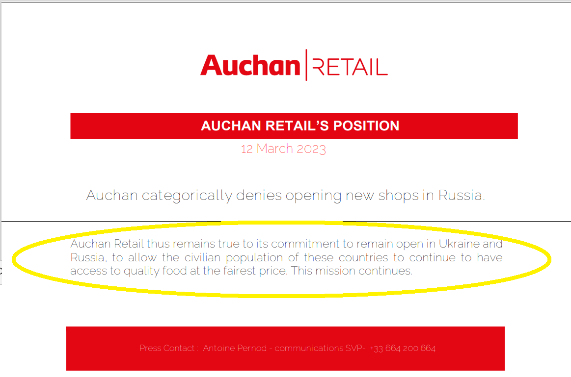 Французский ритейлер Auchan, вынужденный опровергать недавние сообщения в СМИ о том, что компания якобы вдвое расширяет сеть своих магазинов в России, нашел странную аргументацию, почему он вообще до сих пор работает в стране-агрессорке. В обнародованном компанией заявлении отмечается, что Auchan не закрывается не только в России, но и в Украине.