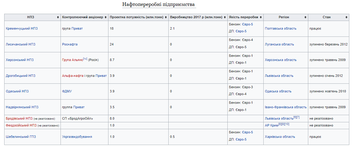 Всего в Украине было 7 нефтеперерабатывающих предприятий, в том числе - три прямо или опосредованно контролируемых Россией. Все НПЗ, кроме двух, прекратили работу с 2009 по 2012 год, в том числе - посредством банкротства.
