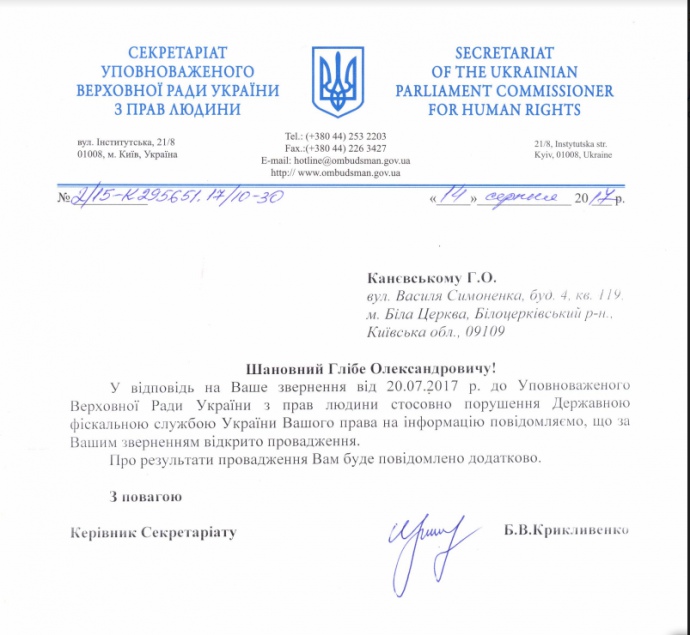 Уполномоченный по правам человека Валерия Лутковская открыла производство на ГФС из-за непредоставления данных о компаниях, которые получили налоговую рассрочку.