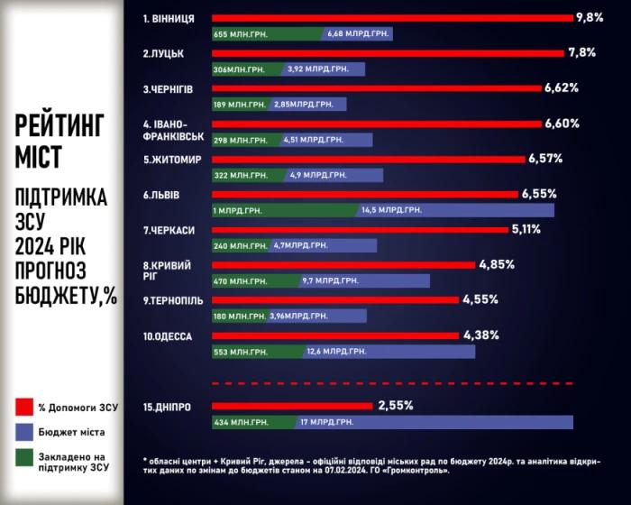 Оказавшийся на втором месте Луцк выделяет 7,8% средств, что составляет 306 миллионов гривен из общего бюджета 3,92 миллиарда гривен.