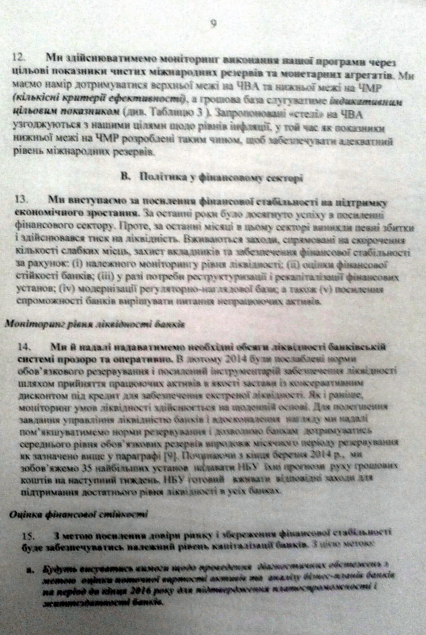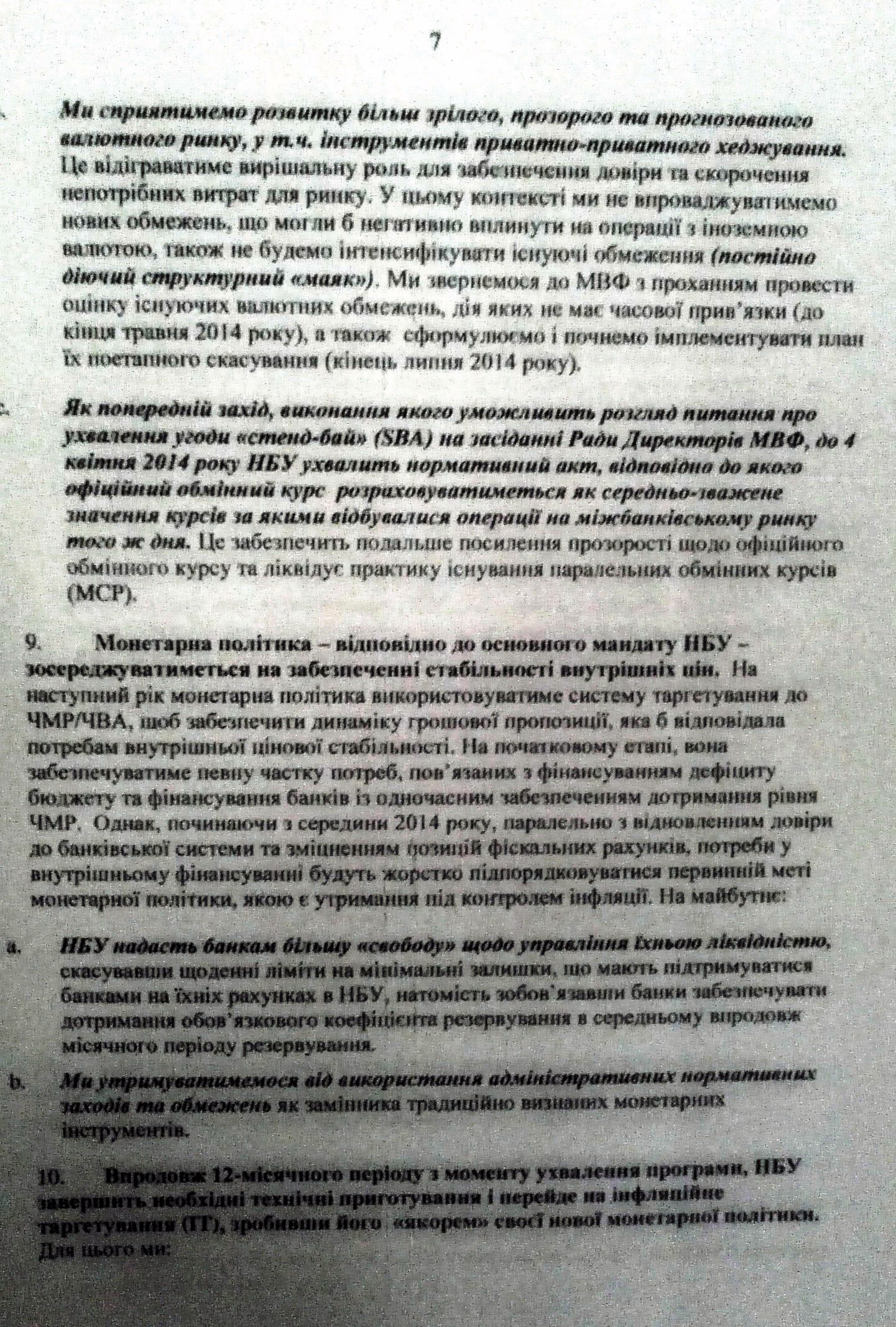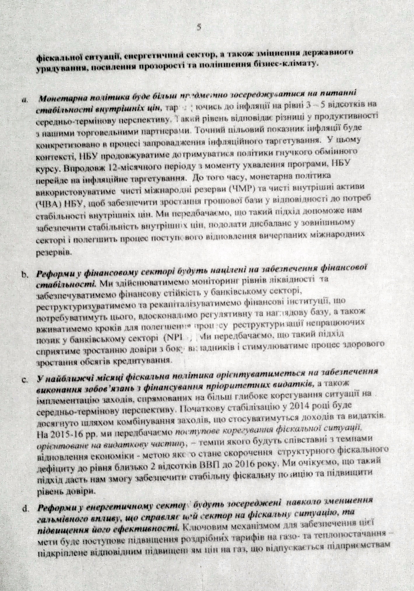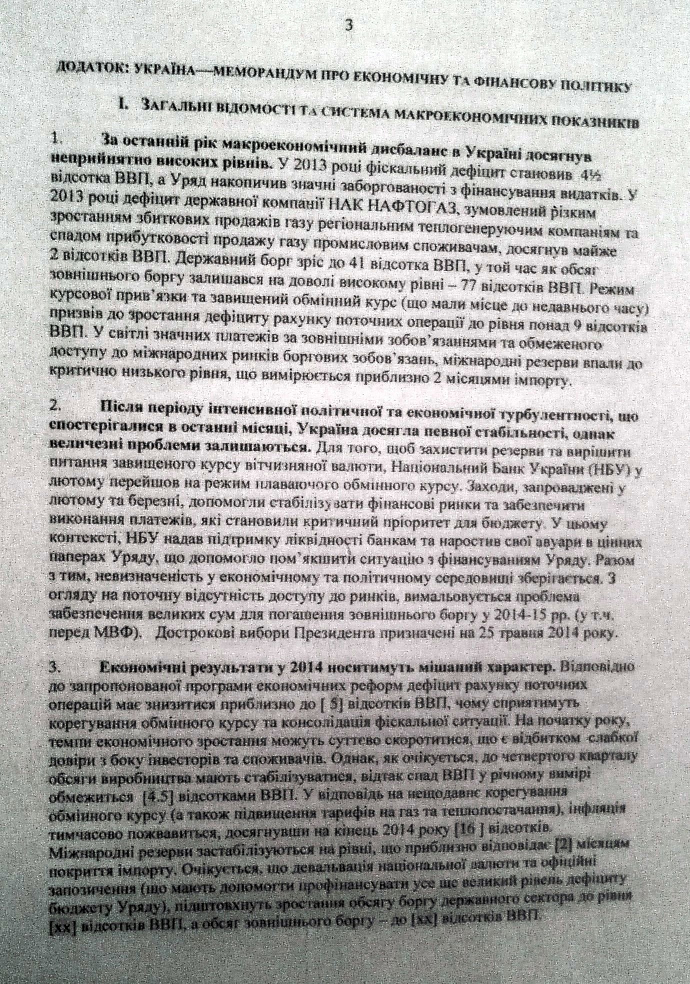 Документ получен ZN.UA сразу из двух источников в Министерстве финансов и Национальном банке. Тексты идентичны за исключением некоторых показателей, которые, насколько известно редакции, проходили согласования вплоть до последнего дня накануне решения МВФ о выделении кредита Украине. Также существуют приложения к меморандуму: (1) перечень предварительных мер и "структурных маяков", (2) график выделения средств и сроков пересмотра программы, (3) количественные критерии эффективности и индикативные целевые показатели.