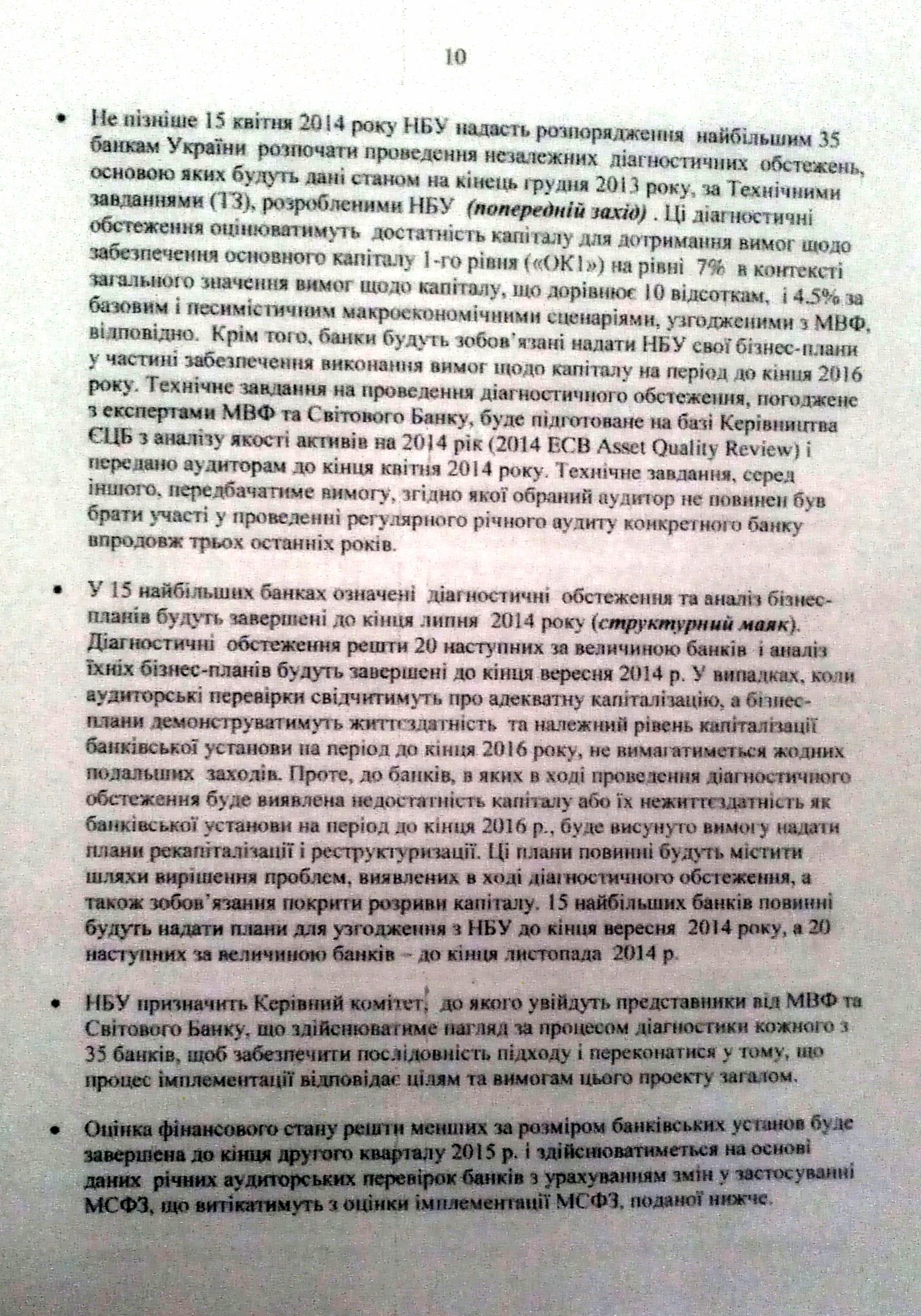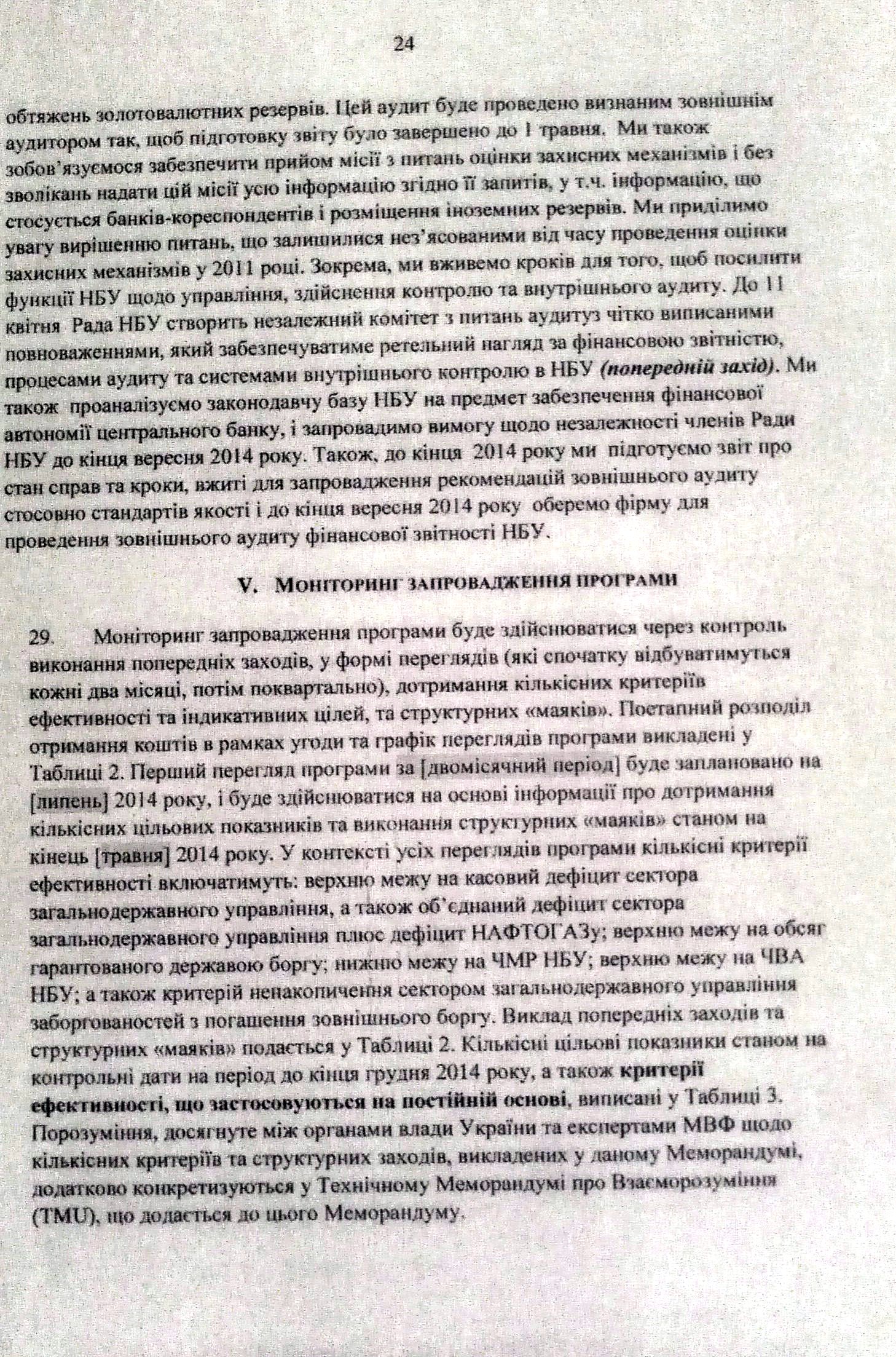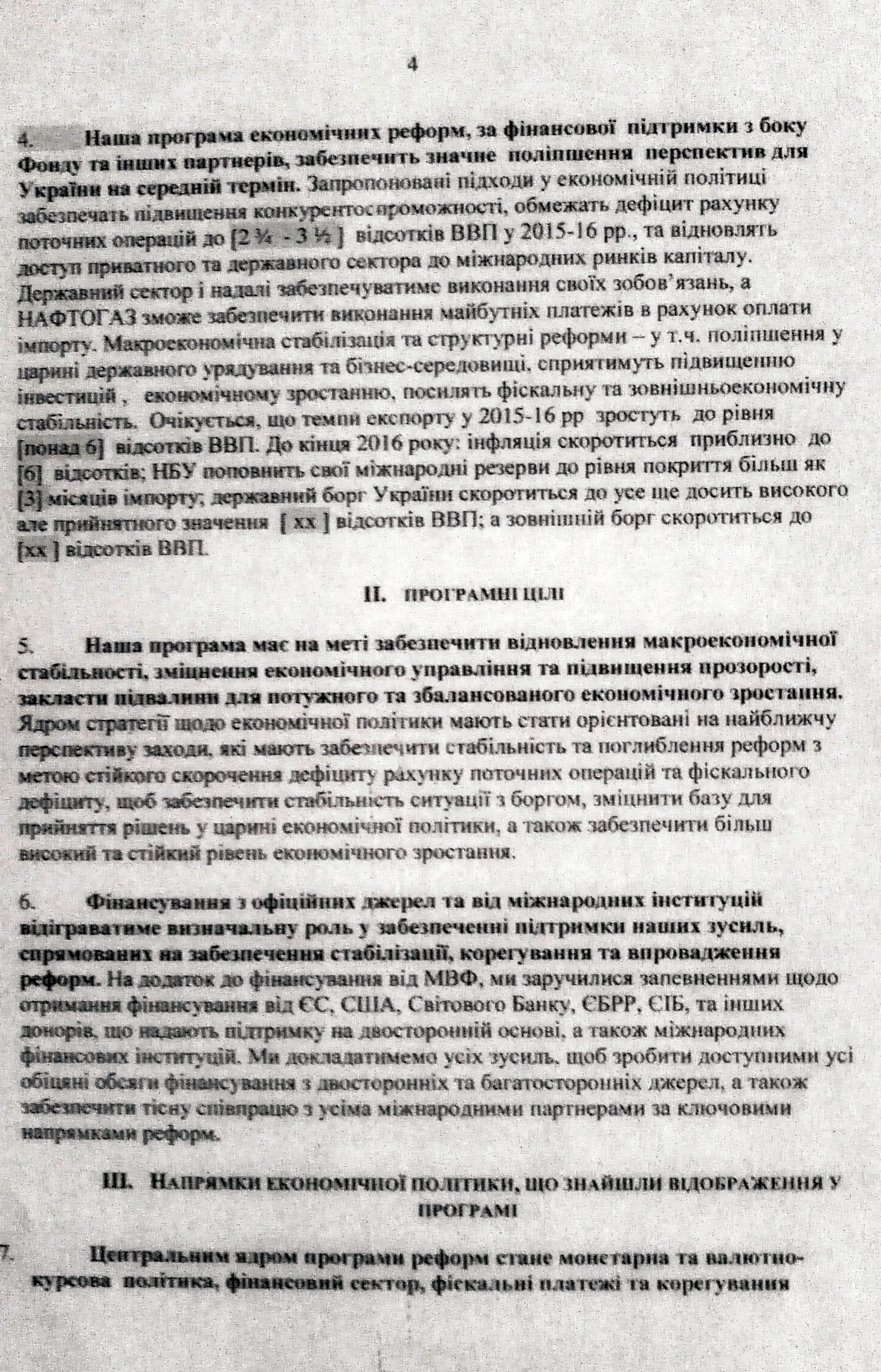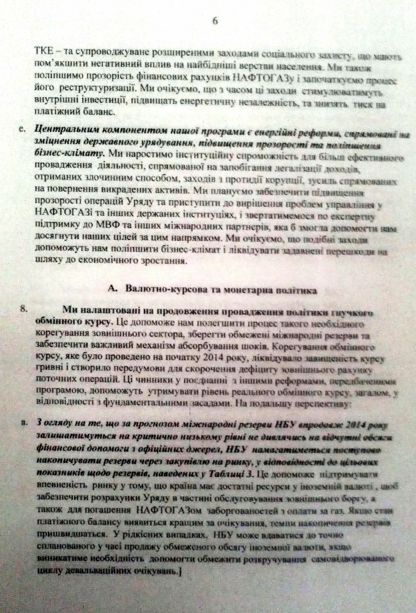 Документ получен ZN.UA сразу из двух источников в Министерстве финансов и Национальном банке. Тексты идентичны за исключением некоторых показателей, которые, насколько известно редакции, проходили согласования вплоть до последнего дня накануне решения МВФ о выделении кредита Украине. Также существуют приложения к меморандуму: (1) перечень предварительных мер и "структурных маяков", (2) график выделения средств и сроков пересмотра программы, (3) количественные критерии эффективности и индикативные целевые показатели.