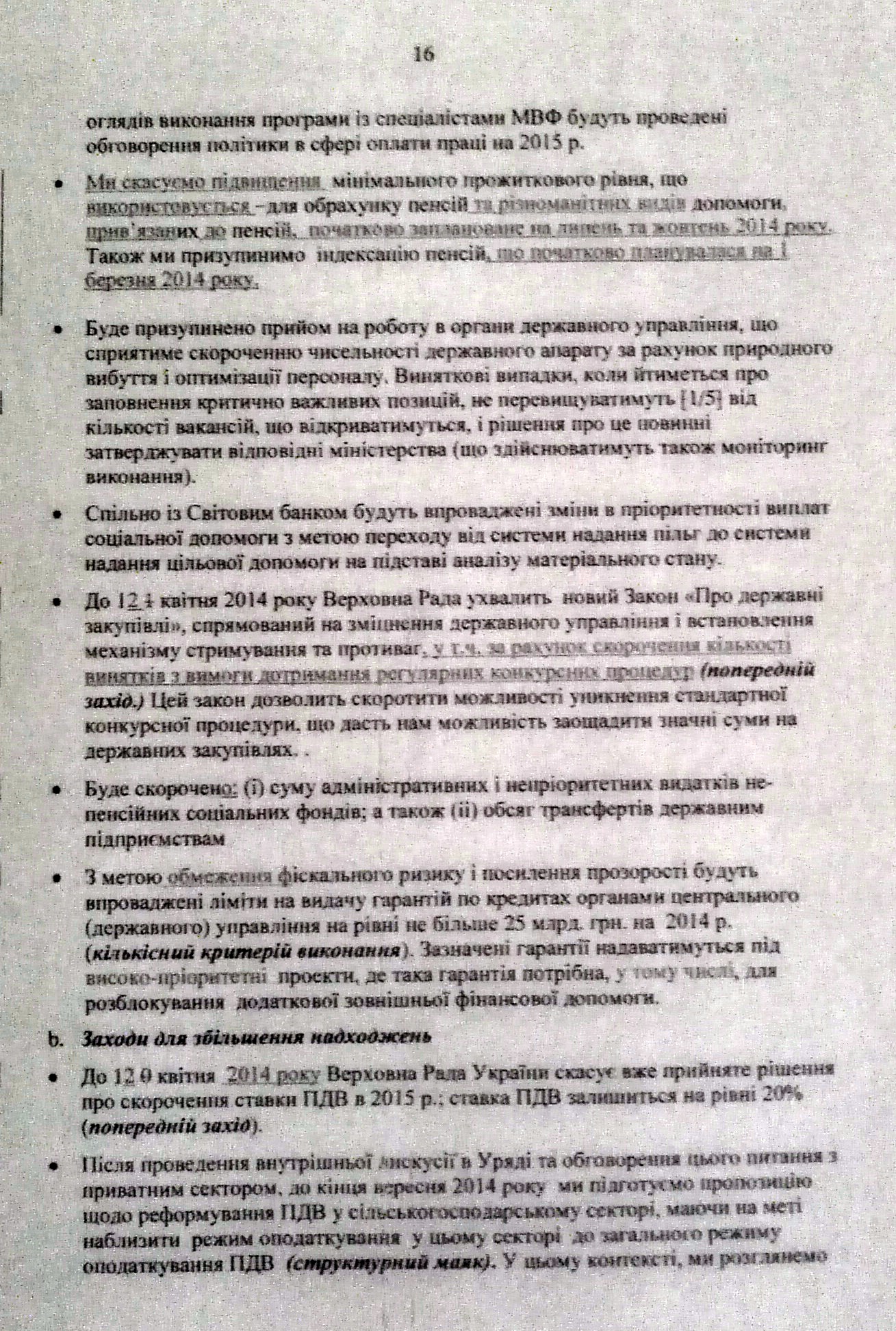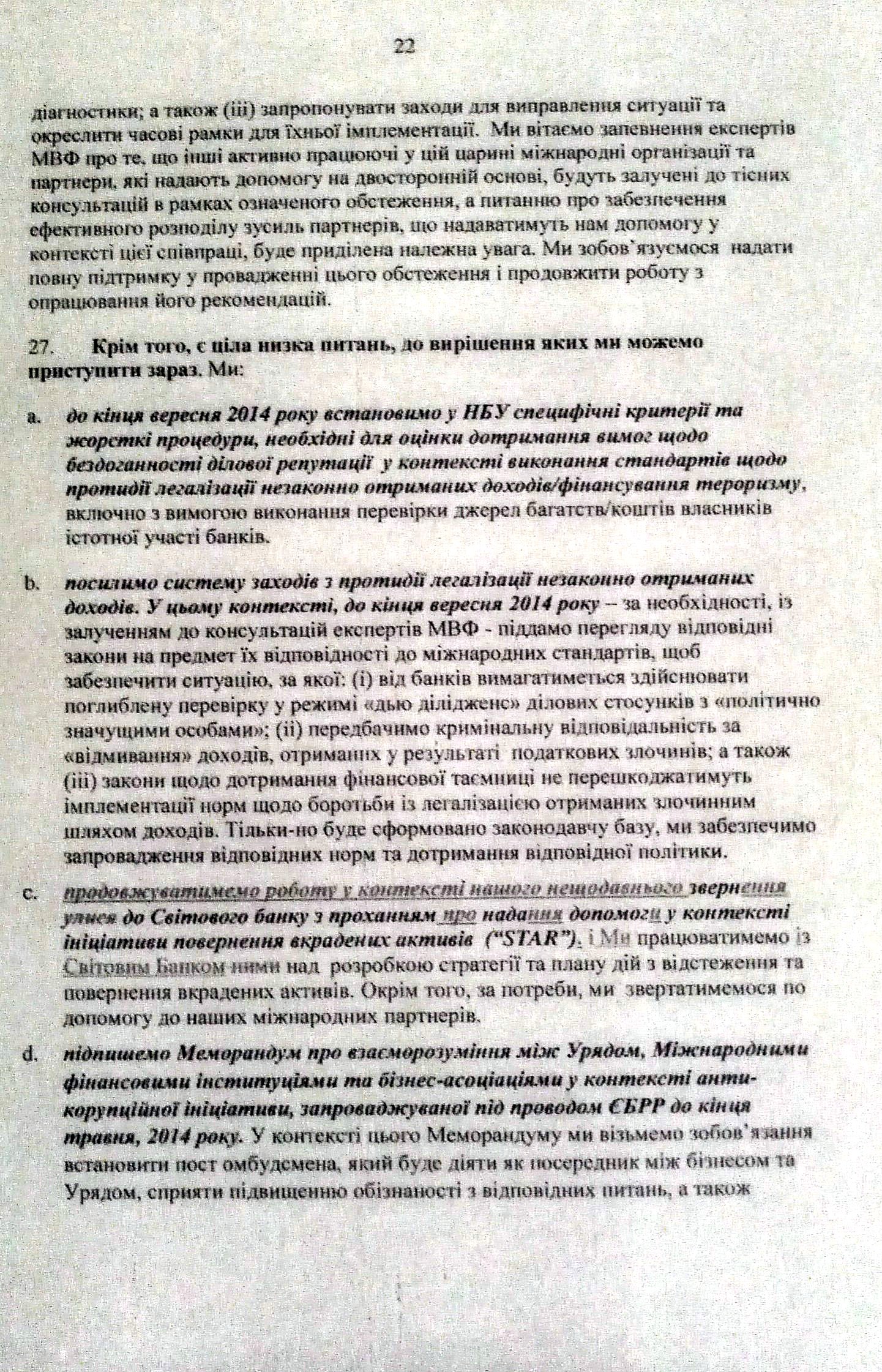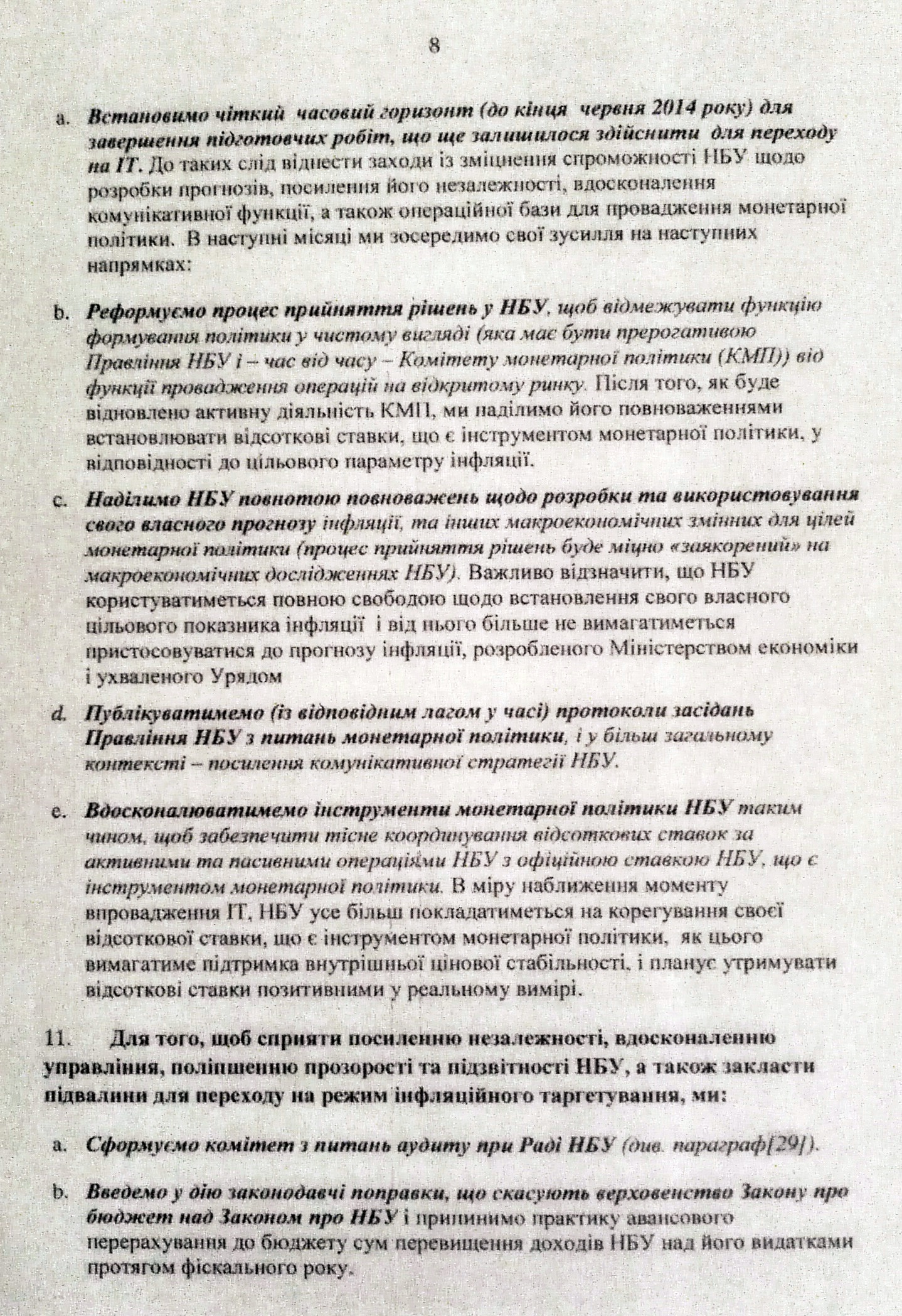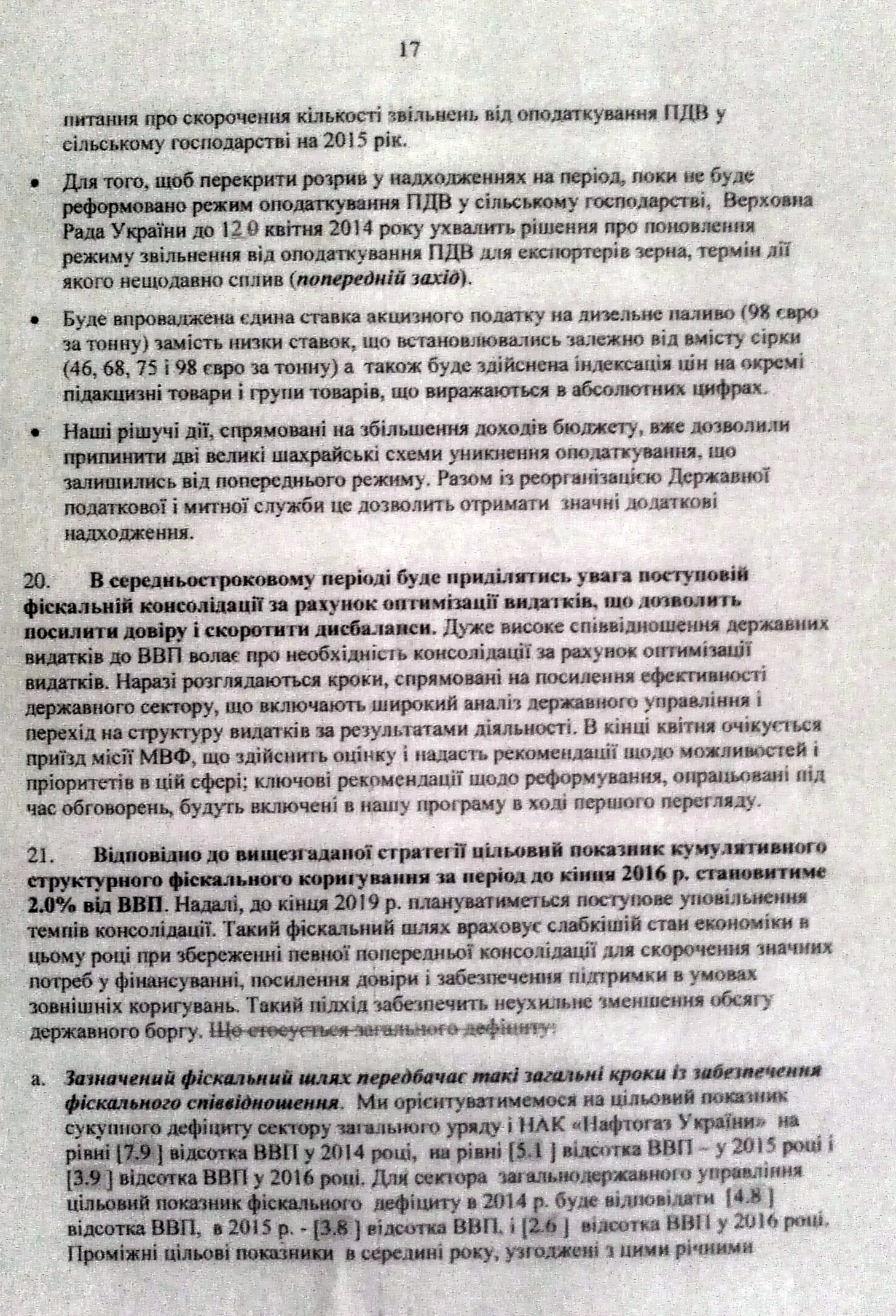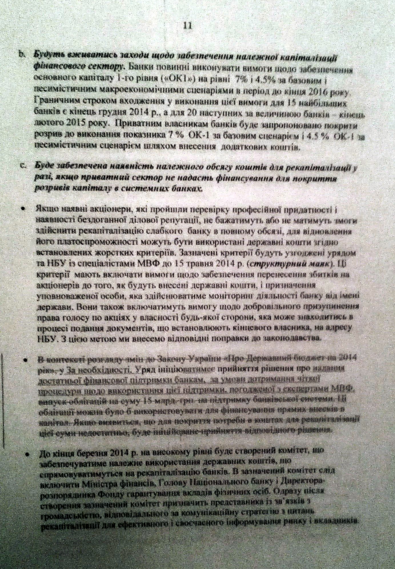 Документ получен ZN.UA сразу из двух источников в Министерстве финансов и Национальном банке. Тексты идентичны за исключением некоторых показателей, которые, насколько известно редакции, проходили согласования вплоть до последнего дня накануне решения МВФ о выделении кредита Украине. Также существуют приложения к меморандуму: (1) перечень предварительных мер и "структурных маяков", (2) график выделения средств и сроков пересмотра программы, (3) количественные критерии эффективности и индикативные целевые показатели.