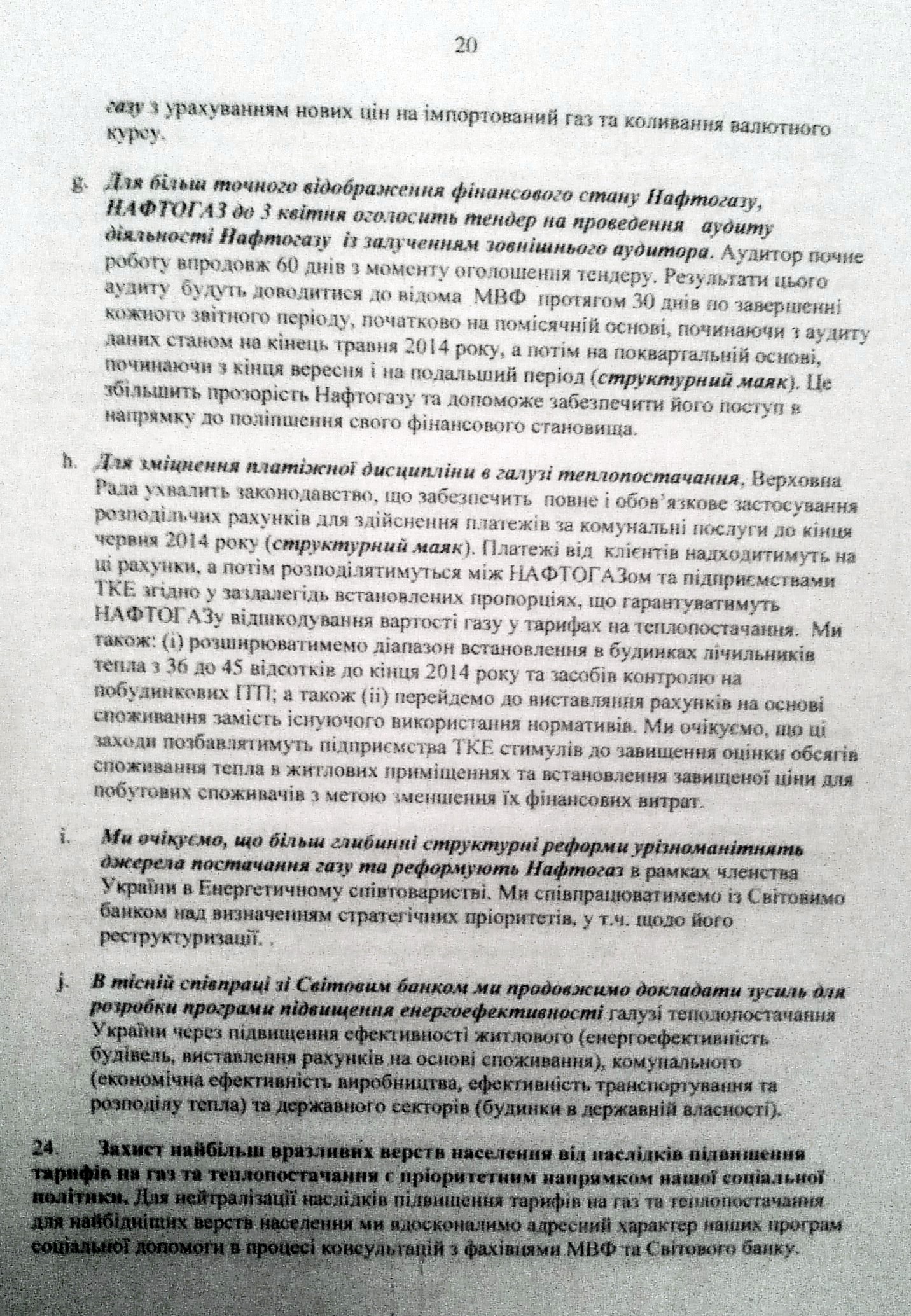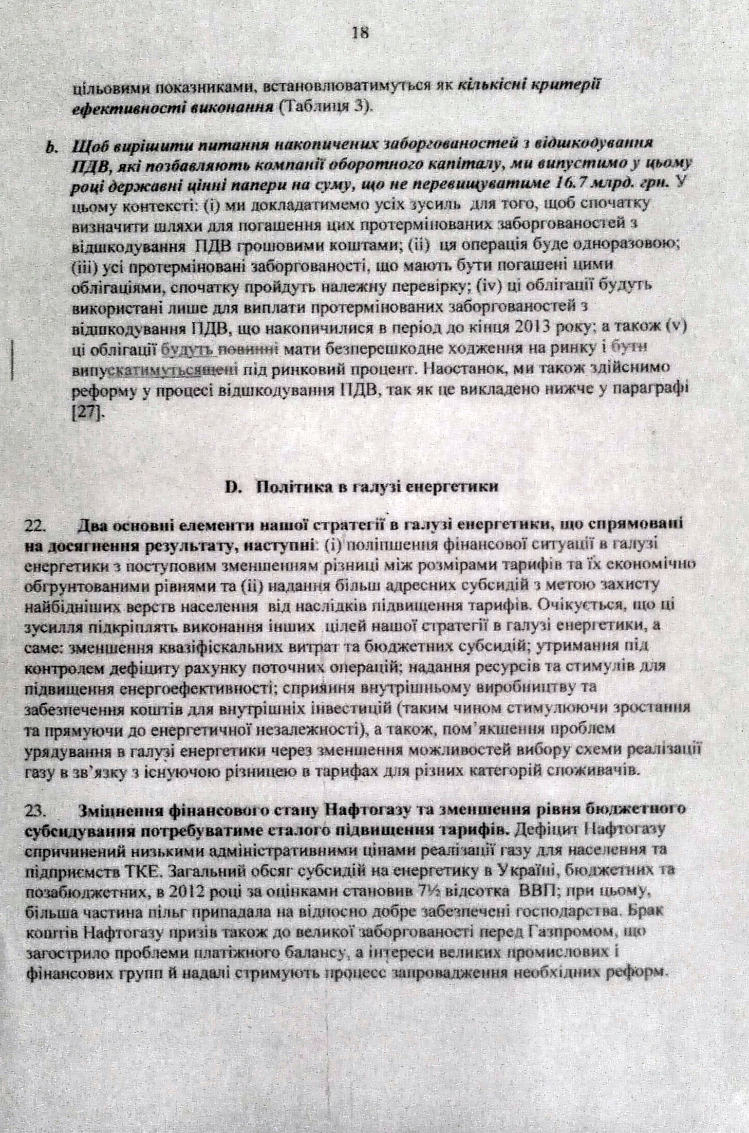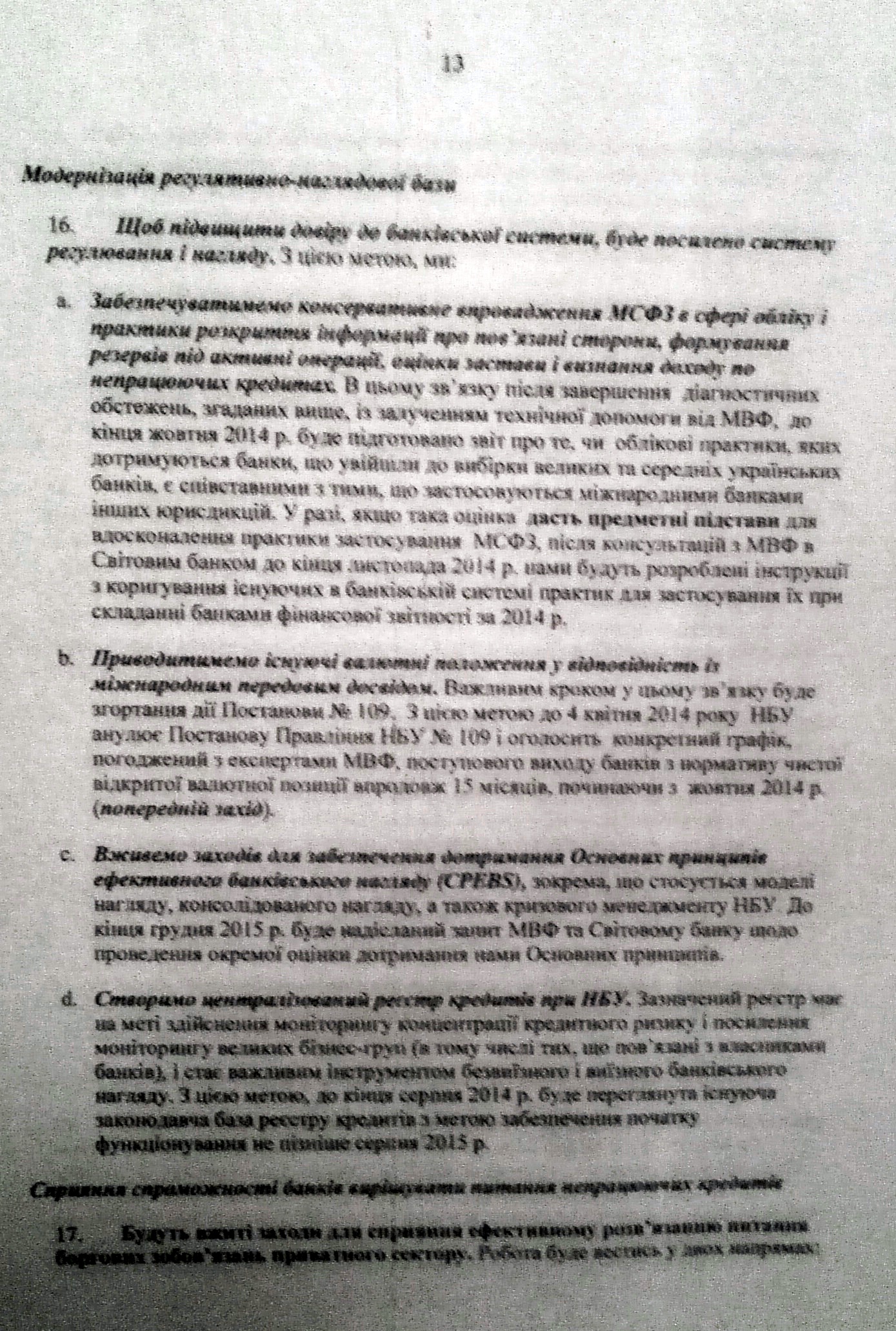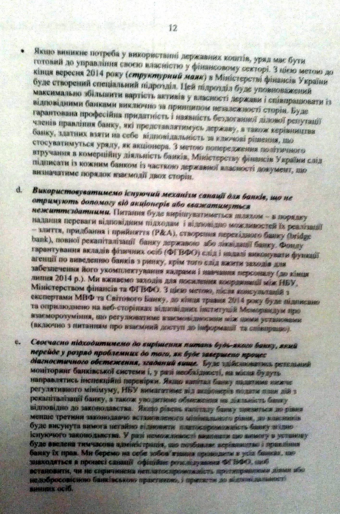 Документ получен ZN.UA сразу из двух источников в Министерстве финансов и Национальном банке. Тексты идентичны за исключением некоторых показателей, которые, насколько известно редакции, проходили согласования вплоть до последнего дня накануне решения МВФ о выделении кредита Украине. Также существуют приложения к меморандуму: (1) перечень предварительных мер и "структурных маяков", (2) график выделения средств и сроков пересмотра программы, (3) количественные критерии эффективности и индикативные целевые показатели.