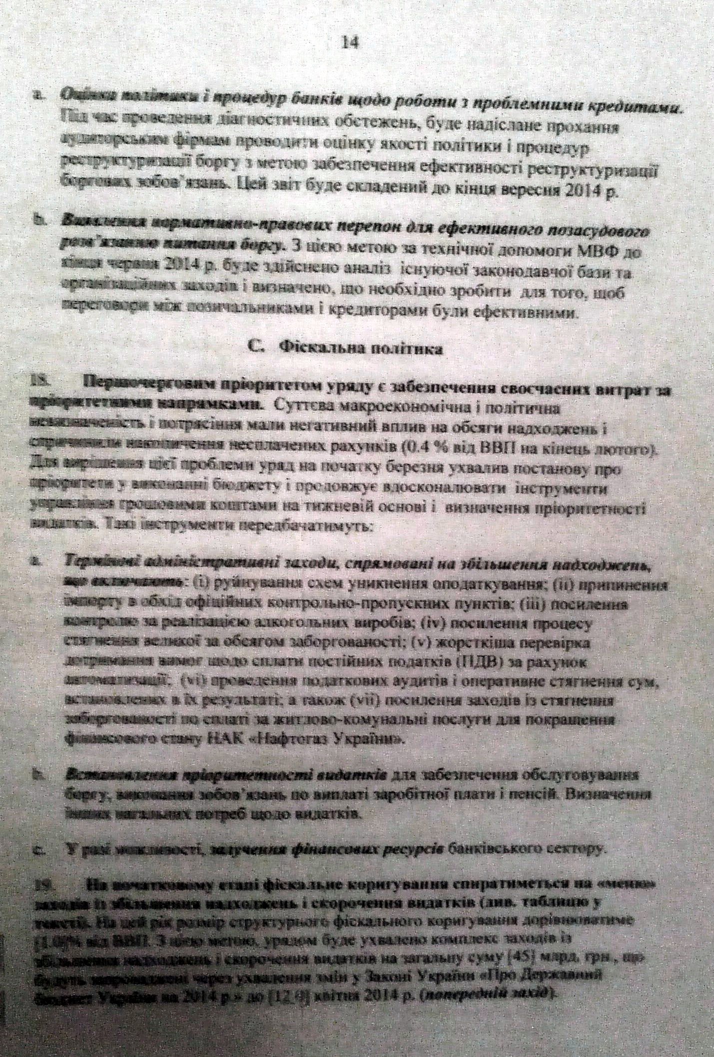 Текст меморандума был разработан в марте 2014-го, по итогам работы миссии МВФ в Киеве. В середине апреля он был направлен в штаб-квартиру фонда в Вашингтоне вместе с Письмом о намерениях, которое подписали четыре руководителя страны: и.о. президента Александр Турчинов, премьер-министр Арсений Яценюк, министр финансов Александр Шлапак, председатель Национального банка Степан Кубив.
