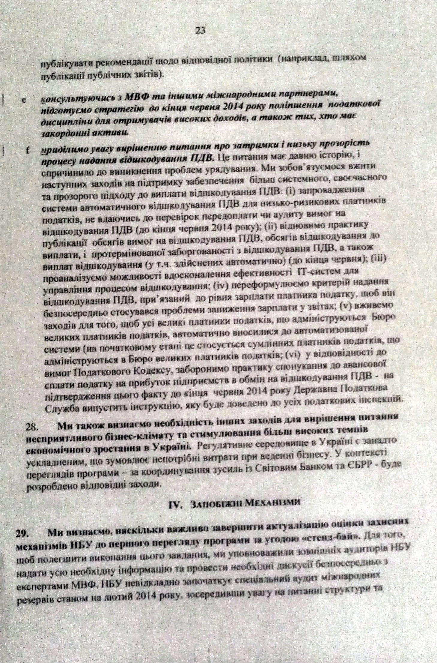 Сумма и транши.Общая сумма двухлетнего кредита (10,976 млрд СПЗ, специальных прав заимствования - валюты МВФ, что сегодня эквивалентно 17,01 млрд долларов США) была согласована лишь в начале 20-х чисел апреля, поэтому она не указана в Письме о намерениях. Программа stand-by предусматривает предоставление ссуды в размере 800% украинской квоты в МВФ. Вместе с тем в Письме о намерениях приведена сумма требуемого первого транша в размере 2,058 млрд СПЗ ($ 3,19 млрд). Вашингтон решил, что из этой суммы 62,7% (около $ 2 млрд) пойдет на покрытие дефицита бюджета. Украинское правительство просило на эти цели половину транша (остальные средства перечисляются НБУ и включаются в состав золотовалютных резервов).