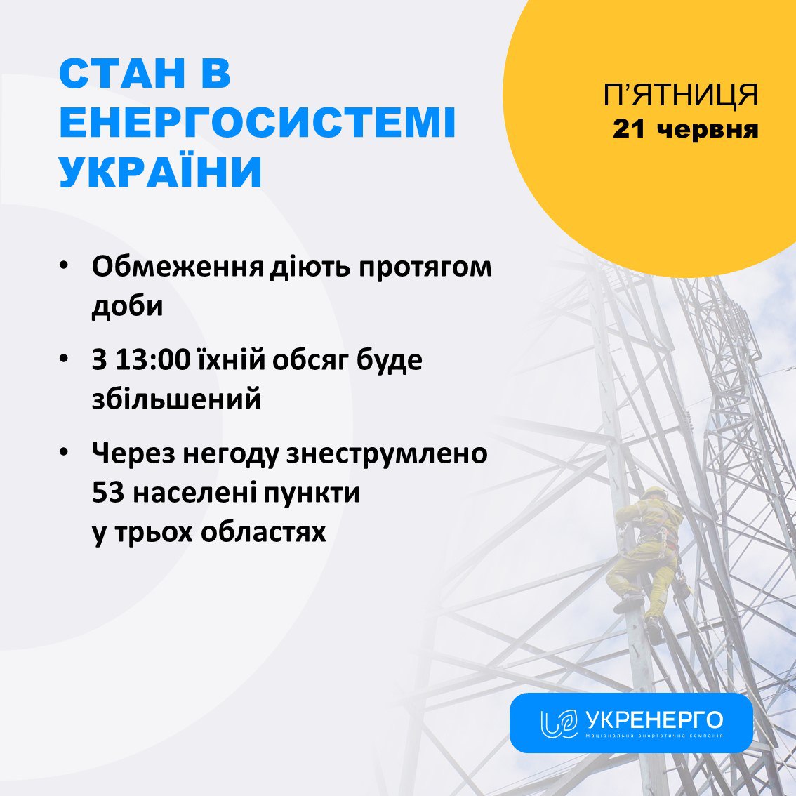 Сегодня, 21 июня, ограничения на поставку электроэнергии будут действовать в течение суток. А с 13:00 объем ограничений будет увеличен. Об этом говорится в сообщении "Укрэнерго".