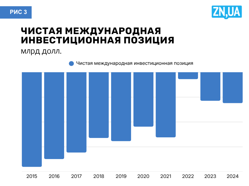 В 2022 году показатель был минимальный, что было обусловлено началом полномасштабной войны, но и в 2024 году он составлял лишь минус 12,5 млрд долл. или 6,57% ВВП.