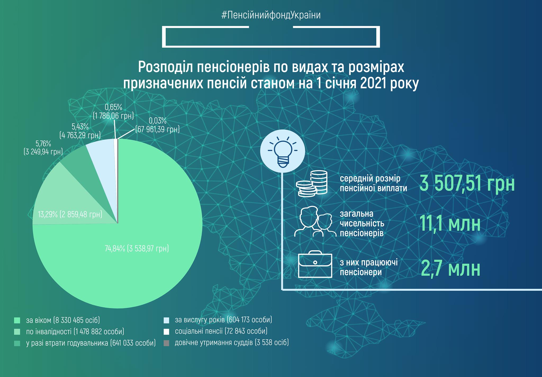 По данным ПФУ, по состоянию на 1 января 2021 года в Украине насчитывалось 11,1 млн пенсионеров, из них 2,7 млн человек – работающие пенсионеры. Средний размер пенсионной выплаты составляет 3507 грн.
