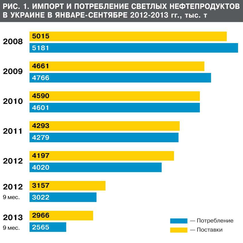 Эксперт отметил, что согласно официальным данным Минэнергоугольпрома, за девять месяцев 2013 г. производство бензина в Украине снизилось на 43,4%, дизельного топлива - на 37,8%. Импорт нефтепродуктов, который должен был компенсировать пикирующее производство, также сократился на 20%.