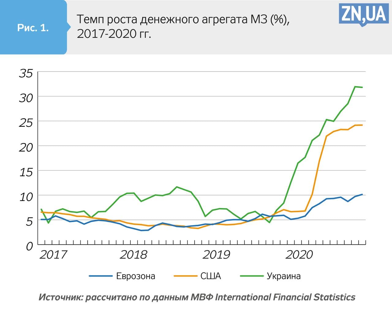 Национальный банк Украины по динамике увеличения денежной массы не только далеко впереди американской Федеральной резервной системы, но и начал монетарное смягчение почти на полгода раньше - еще до начала пандемии COVID-19. Денежная масса в Украине выросла на 28% (рис.1), что в условиях сокращения объемов производства товаров и услуг, объективно снижает спрос на деньги - это отнюдь не признак денежного голода.