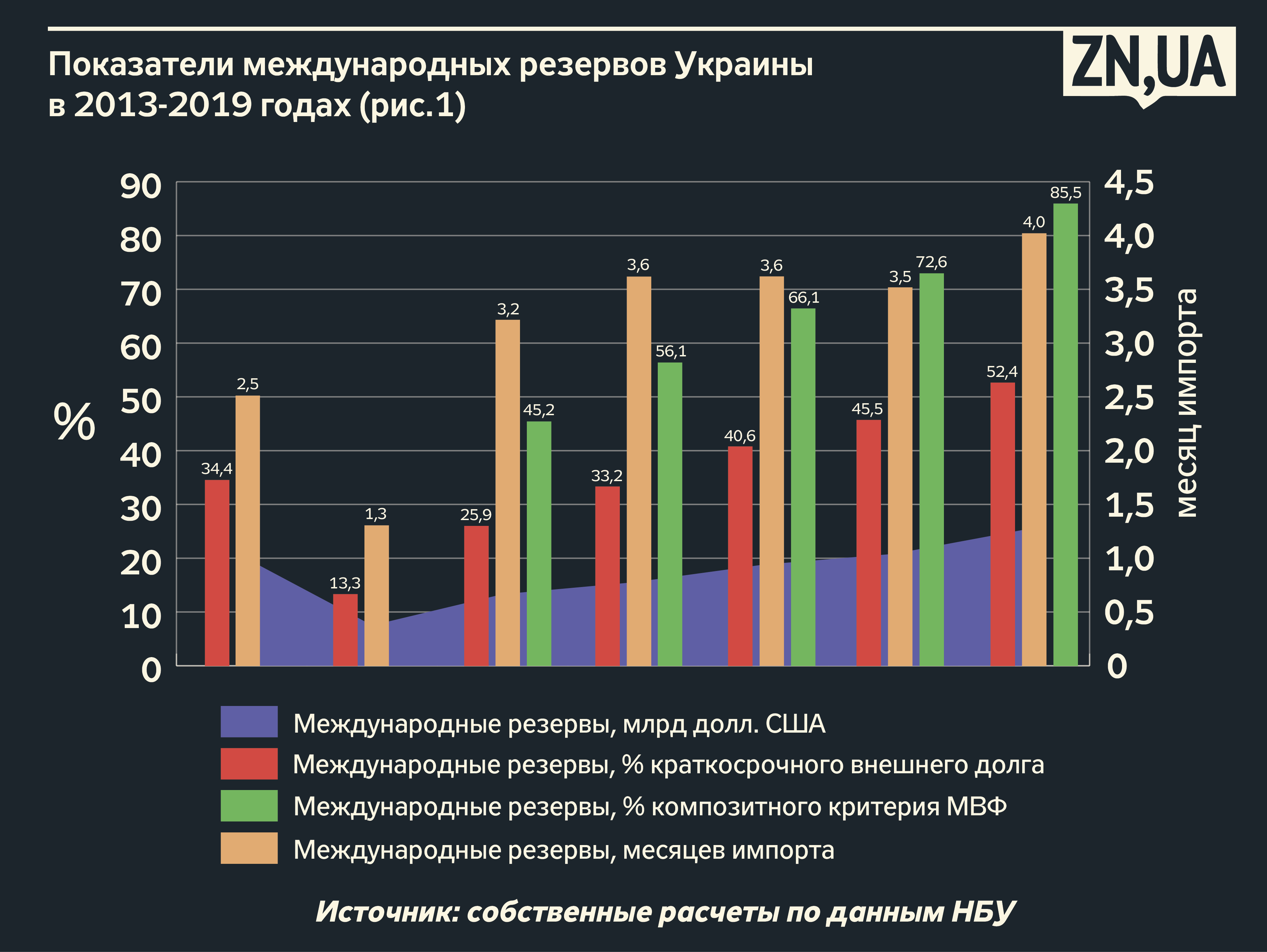 "Базовые показатели адекватности международных резервов (в процентах к краткосрочному внешнему долгу и в процентах к нормативу МВФ) находились на неудовлетворительном уровне. Отношение резервов к краткосрочному внешнему долгу на конец 2019 года составило 52,4% при предельно допустимом уровне 100% (см. рис. 1). Фактический объем международных резервов Украины также находился на уровне 85,5% композитного критерия МВФ, отставая на 14,5% от нормативного значения", - пишет автор.
