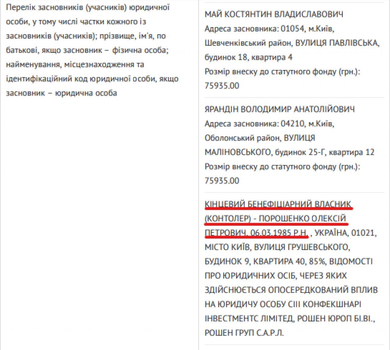 Это подтверждает Единый государственный реестр юридических лиц, физических лиц-предпринимателей и общественных формирований. Там указано, что контроль над ЦЕКК перешел к Порошенко-младшему в результате получения корпоративных прав на нидерландскую Roshen Europe B. V., которая владеет 85% ЦЕКК. Ранее Roshen Europe B. V. принадлежала Порошенко-старшему, согласно его последней декларации.