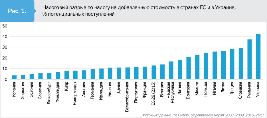 Современным инструментом оценки потери налоговых доходов государства от НДС является показатель налогового разрыва (tax gap). По оценкам Института экономики и прогнозирования НАН Украины, в 2015-м потери поступлений НДС (налогового разрыва по НДС) достигали 42,3% потенциальных поступлений. Между тем в среднем по странам ЕС, по оценкам европейских экспертов, недополученные доходы от НДС в 2015 г. уменьшились до 12,8% потенциальных поступлений (по сравнению с 15% в 2012–2013 гг.) и составляли от 3,5% в Испании до 37,2% в Румынии.