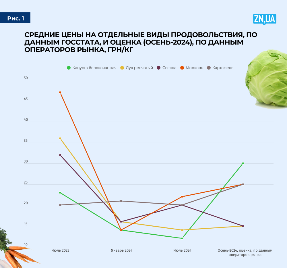 Капуста. Цены на белокочанную в августе 2024 года выросли против показателя на конец июня втрое и составляют 30−33 грн/кг. Но это столица. Средняя цена по стране — 12,75 грн/кг. По прогнозам аграрных ученых, потери урожая капусты из-за вредителей продолжат держать довольно высокие цены на нее.