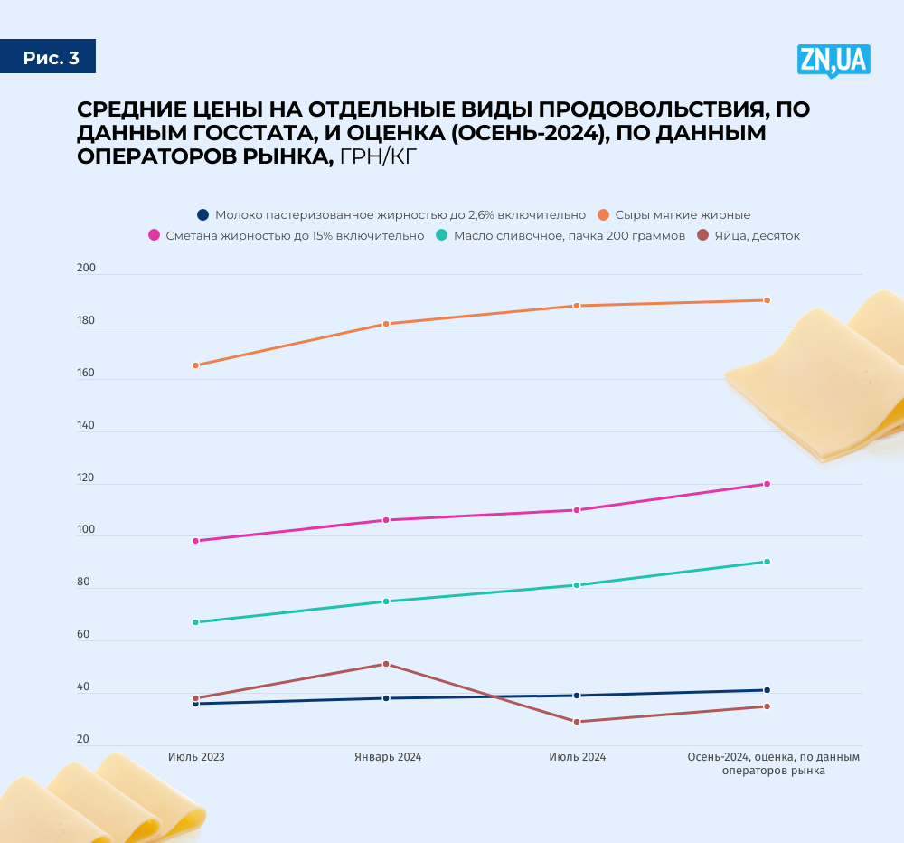 Молочка поддерживает тренды. Молоко (жирностью 2,5%) подорожало с начала года на гривню за литр. Средняя цена — 39 грн.