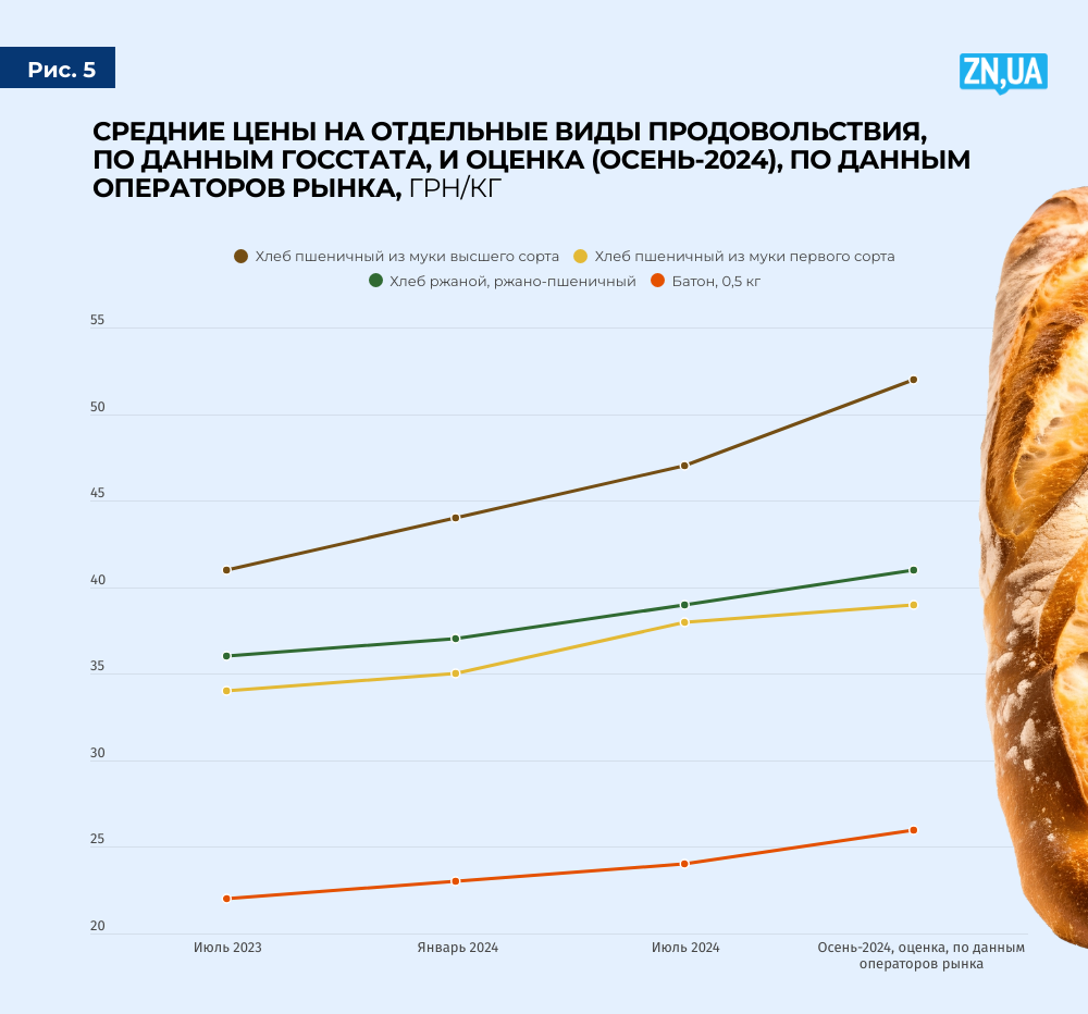 Хлеб из муки 1-го сорта в среднем по стране стоит 38,35 грн/кг. В начале года — 35,72 грн/кг. А в июле 2023-го килограмм массового хлеба, выпекаемого заводами, обходился в 34,9 грн/кг. Еще одну позицию выделим — батон. Лето 2024-го — 24,6 грн/500 граммов, лето 2023-го — 22,38 грн.