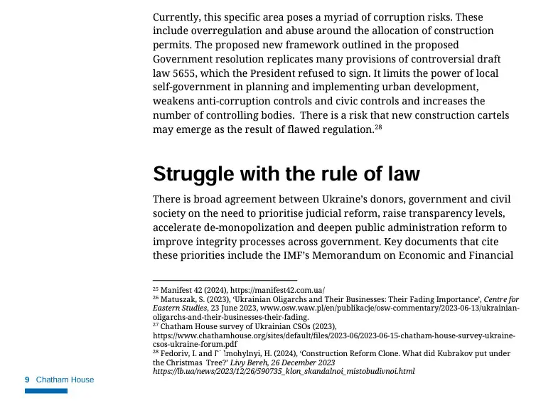 «Есть риски, что появятся новые группы влияния, которые постараются сохранить действующую систему… Гражданское общество обеспокоено, что вокруг средств на реконструкцию могут возникать новые группы интересов и 50% респондентов в опросе общественного сектора, как провел Chatham House, отметили, что есть такой риск. Одним из таких секторов для этой зоны риска является строительная отрасль… Значительные части национального и местных бюджетов будут выделены на социальное жилье и новую инфраструктуру. Прогнозируется, что этот сектор будет расти и консолидироваться с крупными компаниями, обеспечивающими до 80% строительных потребностей по всей стране. Пока эта конкретная отрасль создает множество рисков коррупции», – говорится в документе.