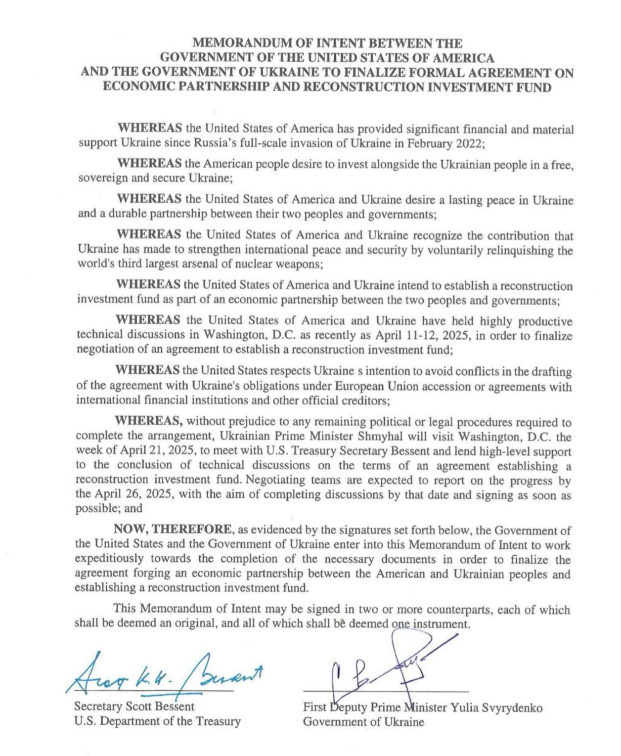 Подписание меморандума прошло в онлайн-формате. С украинской стороны документ подписала министр экономики Юлия Свириденко, с американской – министр финансов Бессент.