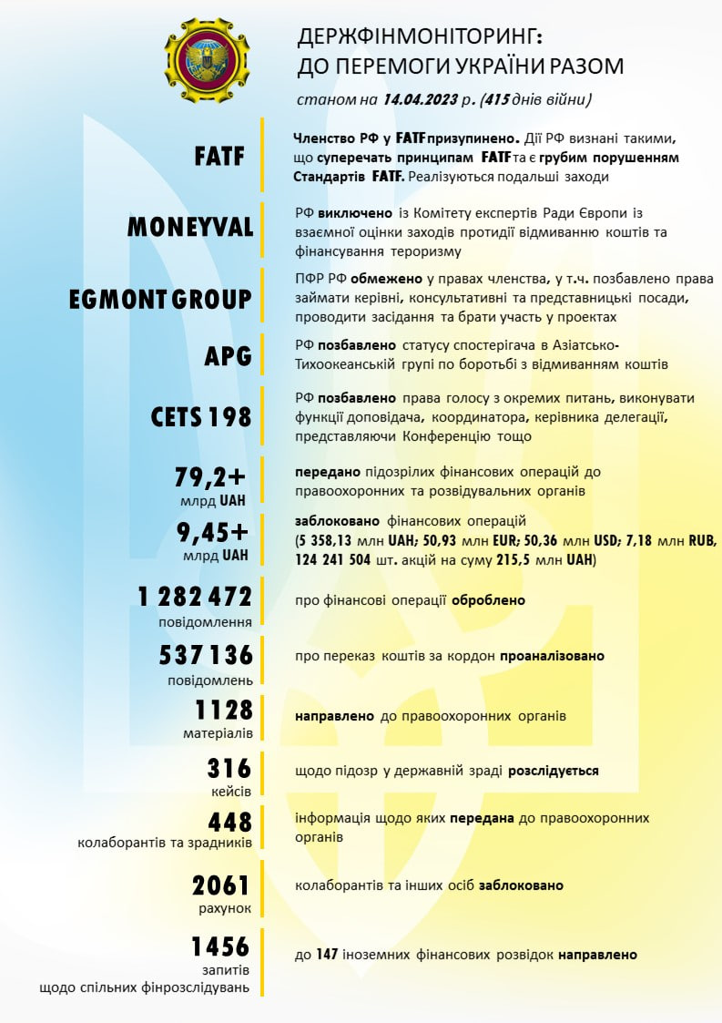 Также благодаря работе Госфинмониторинга в правоохранительные и разведывательные органы переданы данные о подозрительных финансовых операциях на сумму 79,2 млрд грн. Еще заблокированы финансовые операции на 9,45 млрд грн.