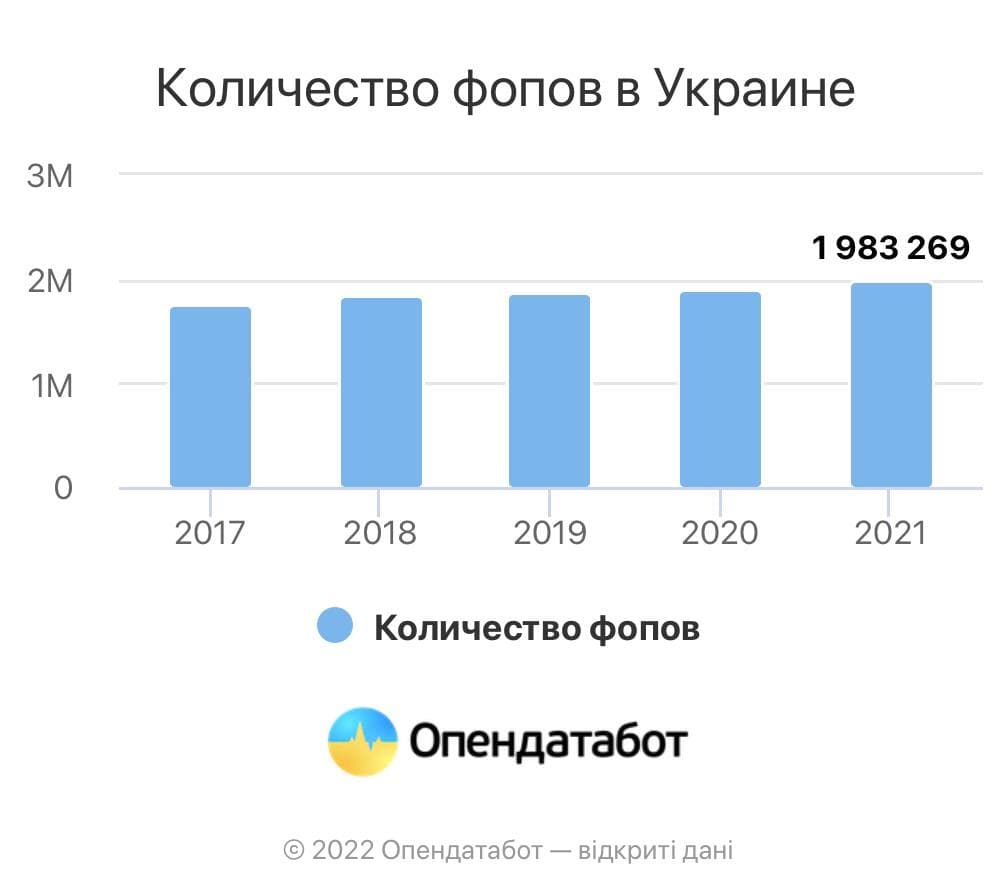 По итогам 2021 года количество ФОПов в Украине выросло на 83 257 (на 4%) и на данное время их численность составляет почти 2 млн. Это самый высокий результат за последние 5 лет. Об этом говорится в исследовании на сайте Опендатабот.