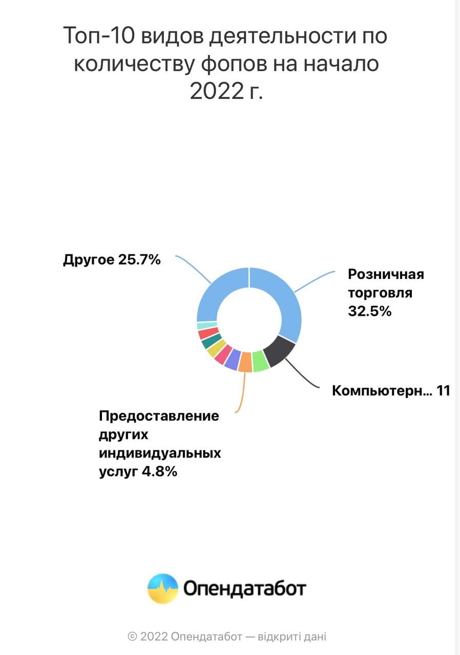 «На втором месте — бизнесы, предоставляющие информационные услуги (+9 тыс. или 24%). На третьем месте — фопы кафе и ресторанов (+6 тыс. или +10%), которые выросли несмотря на локдауны и карантинные ограничения. Количество предпринимателей, занимающихся розничной торговлей, выросло на 7 тыс. единиц, что, впрочем, составляет лишь 1% от их общего количества», - говорится в исследовании.