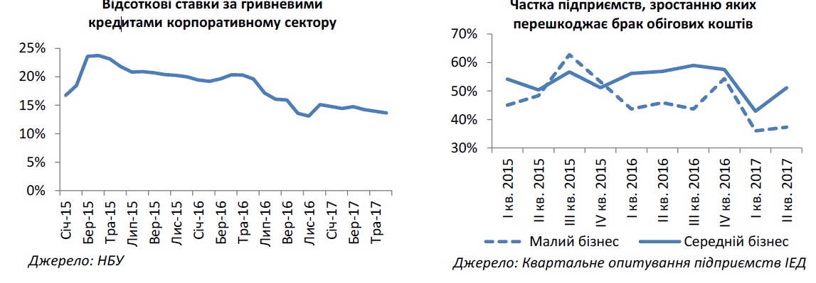 "Во втором квартале 2017 года 39% малых и 42% средних предприятий сообщили об увеличении потребности в заемных средствах в рамках опроса НБУ о деловых ожиданиях предприятий. После начала постепенного восстановления экономической активности в 2016 году доля МСП, которым нужны были дополнительные заемные средства, колебалась в пределах 40%", - говорится в документе.