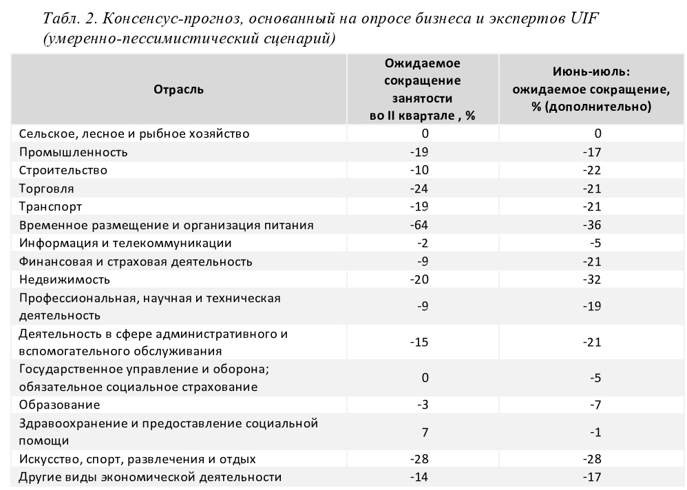 6. Ожидаемое сокращение занятости в разрезе отраслей приведено в табл. 2.