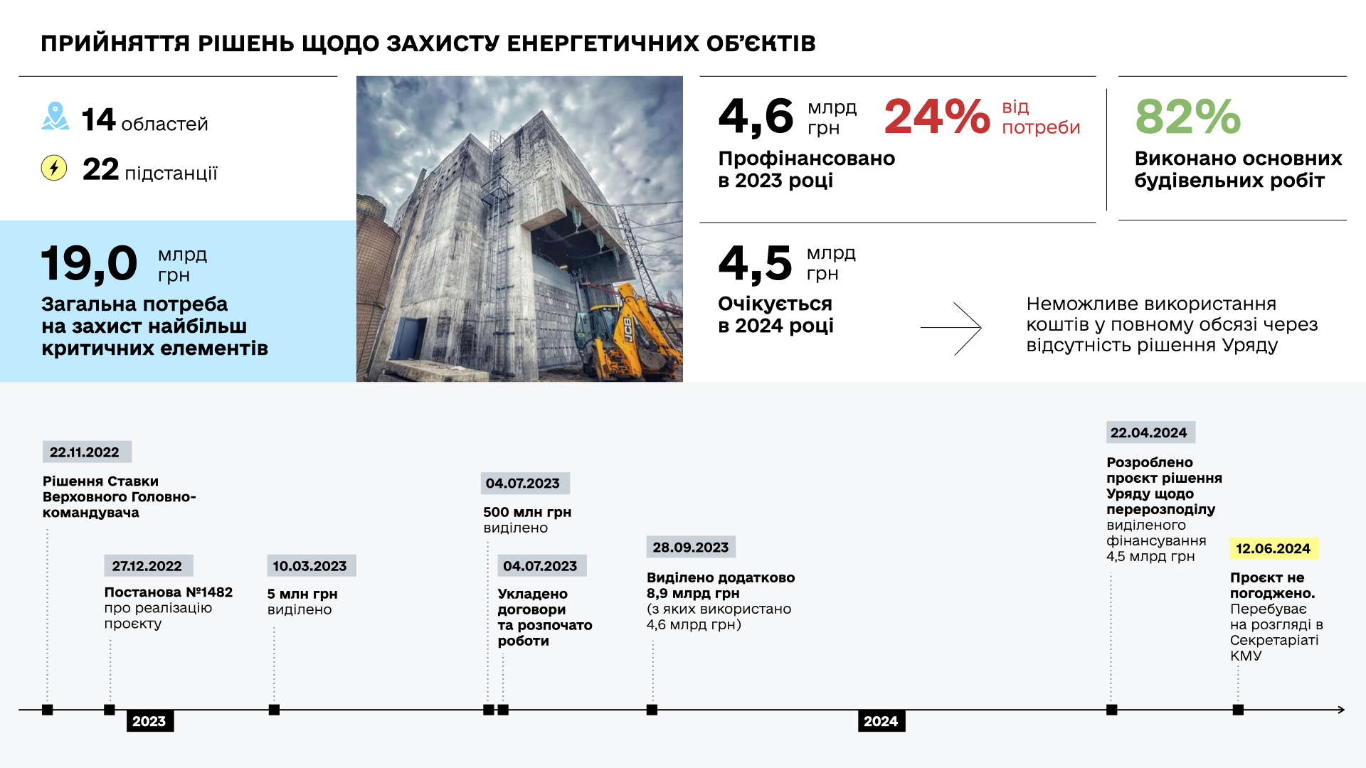 “В настоящее время агентство на 82% завершило основные строительные работы по устройству сооружений ІІ-го уровня защиты в 14 областях страны. По состоянию на 12.06.2024 завершены основные строительные работы на 20 критически важных... На завершающем этапе основные строительные работы еще на 23 критически важных элементах. Всего будут защищены 43 критически важных элемента на электрических подстанциях НЭК "Укрэнерго", - говорится в отчете. По оценке агентства, защита сработала для дорогостоящего оборудования энергетики в Харьковской, Николаевской и Одесской областях.