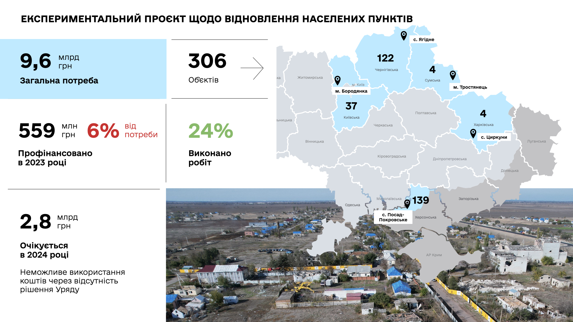 Агентство отмечает, что в 2023 году в рамках реализации экспериментального проекта началось восстановление 5 населенных пунктов, в том числе поселка Бородянка в Киевской области, города Тростянец в Сумской области и сел в Харьковской, Херсонской и Черниговской областях. “В процессе работы по этому направлению агентство также столкнулось с задержками в рассмотрении наших предложений и несоблюдении сроков финансирования проектов.
