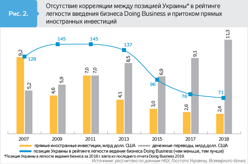 Об этом в своей статье для ZN.UA пишет Андрей Гайдуцкий, доктор экономических наук. По его словам, за 2007–2018 гг. иностранные инвестиции сократились почти в четыре раза, даже несмотря на то, что позиция нашей страны в рейтинге легкости ведения бизнеса Doing Business улучшилась почти вдвое.