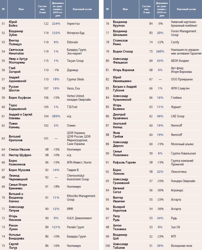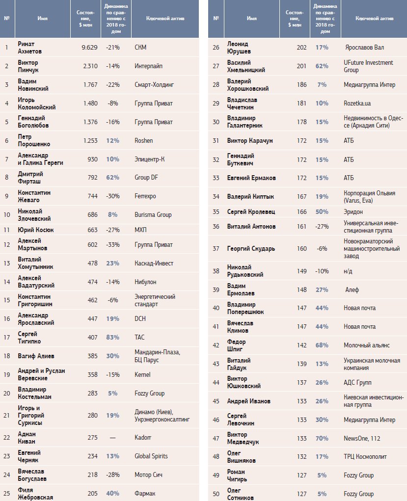 Первая пятерка в рейтинге та же, что и в 2018 году, только Коломойский обогнал Боголюбова. При этом из второй части первой десятки выпали владелец МХП Юрий Косюк (11-е место) и совладелец группы "Приват" Алексей Мартынов (12-е). Пятый президент Петр Порошенко остался на шестом месте. Мажоритарный акционер Ferrexpo Константин Жеваго опустился на девятое место, уступив седьмое совладельцам Эпицентр-К Александру и Галине Герегам. В десятку попали Фирташ (поднялся на восьмое место) и Николай Злочевский (на 10-е).