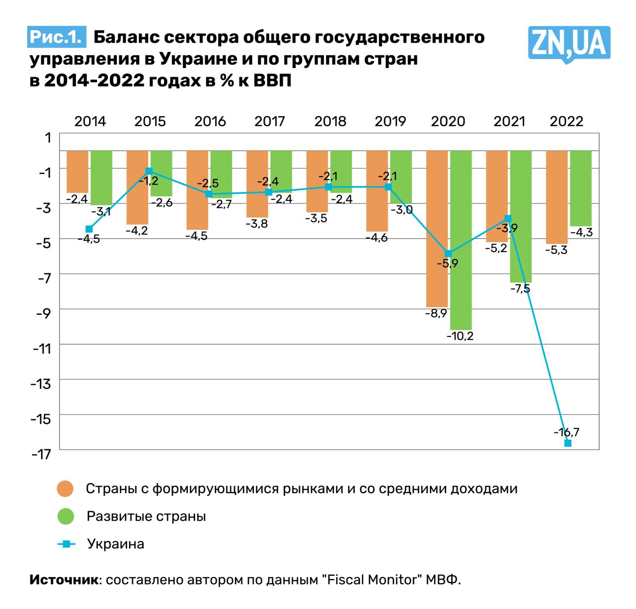 Дефицит общего госуправления в Украине в 2022 году составил 16,7% ВВП. Этот показатель на 4,3% превысил средние показатели развитых стран и на 5,3% – показатели стран с формирующимися рынками.