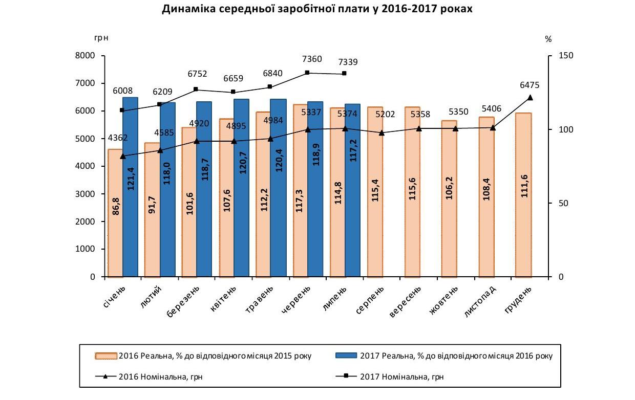 Средняя номинальная заработная плата штатного работника предприятий, учреждений и организаций Украины в июле 2017 года составила 7339 грн, увеличившись по сравнению июлем прошлого года на 36,6%, сообщает Государственная служба статистики Украины.