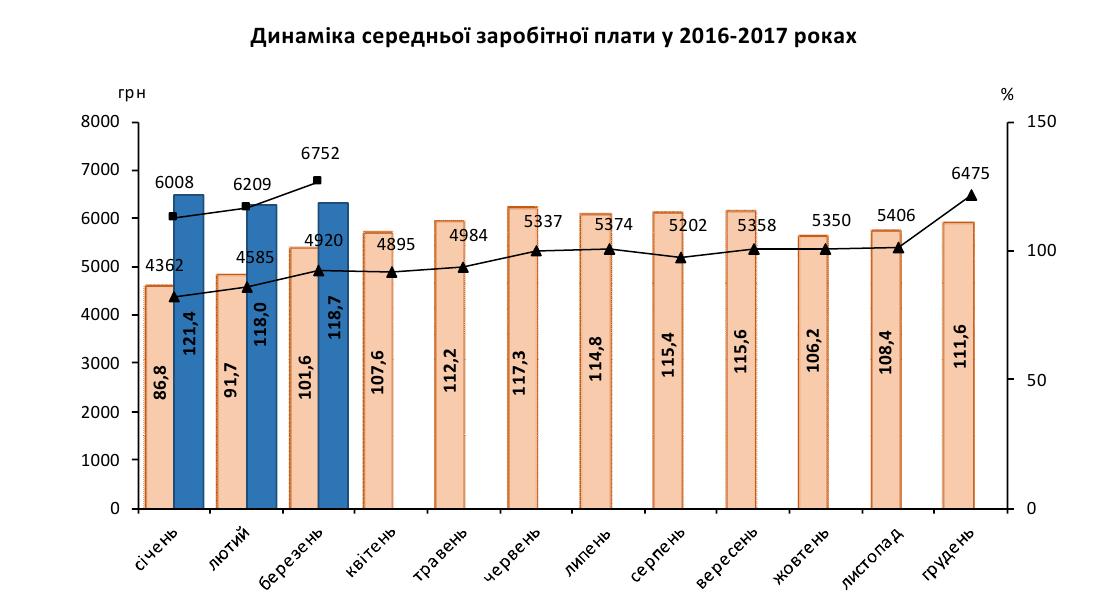 Средняя номинальная заработная плата штатного работника предприятий, учреждений и организаций Украины в марте 2017 года составила 6752 грн, увеличившись по сравнению мартом прошлого года на 37,2%, сообщает Государственная служба статистики Украины.