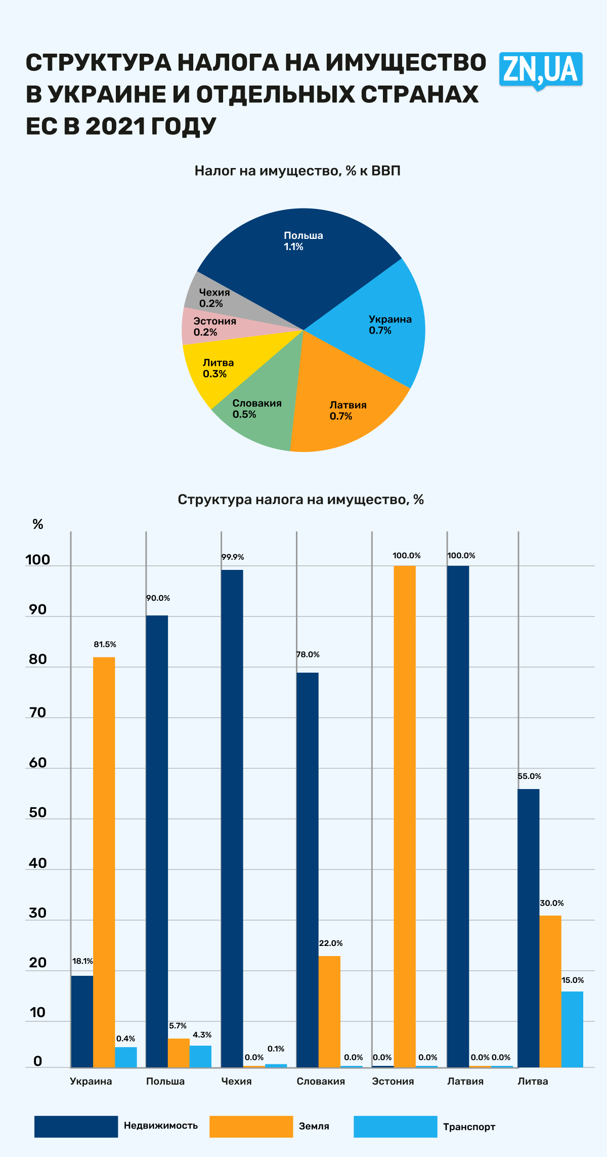 Итак, как показано в приведенной ниже таблице, совокупная доля в ВВП налога на имущество в Украине в 2021 году составляла 0,7%, что отвечает уровню Латвии. Основные поступления от имущественных налогов в Украине собираются с земельных участков, и это не удивляет. Например, в Эстонии базой имущественного налога вообще выступает только земля. В отличие от этого, Латвия облагает налогами лишь жилую и нежилую недвижимость, ее же в основном облагают налогами и поляки. Наверное, Литва в наибольшей степени из представленных стран приблизилась к паритету в соотношении поступлений налога от недвижимости, земли и транспорта.