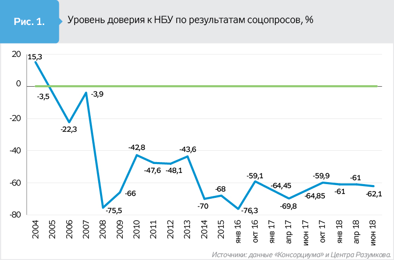 Баланс доверия/недоверия к НБУ в июне 2018 г. склонялся в сторону недоверия, которую высказывали 62,1% граждан. Подобным, но чуть ниже является рейтинг доверия самих банков (-69,6%). Подтверждают эти данные и иностранные организации, в частности USAID. При этом по всем исследованиям эти показатели в течение 2016-2018 гг заметных положительных тенденций не демонстрируют.