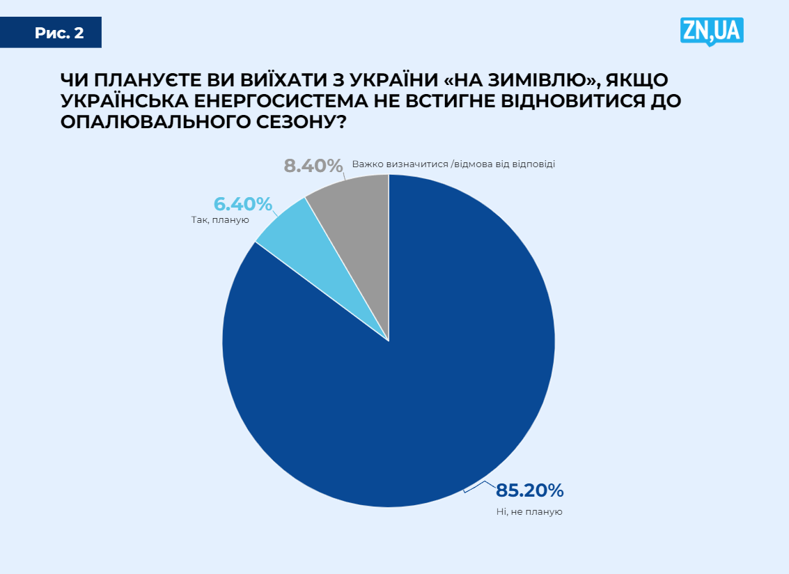 Согласно опросу, только 6,4% украинцев планируют переезд. Они одобрительно ответили на вопрос «Планируете ли вы уехать из Украины «на зимовку», если украинская энергосистема не успеет восстановиться к отопительному сезону?». 85,2% ответили, что не планируют никаких переездов в связи с систематическими отключениями света.