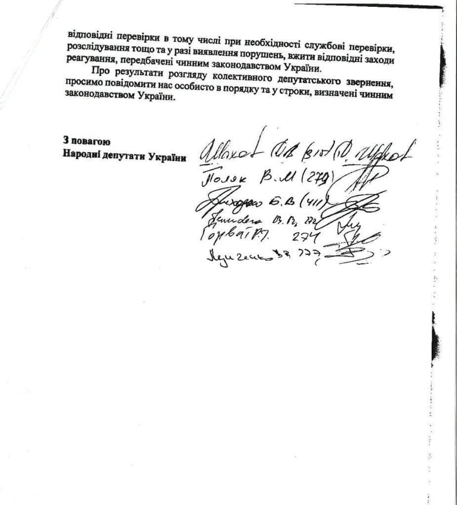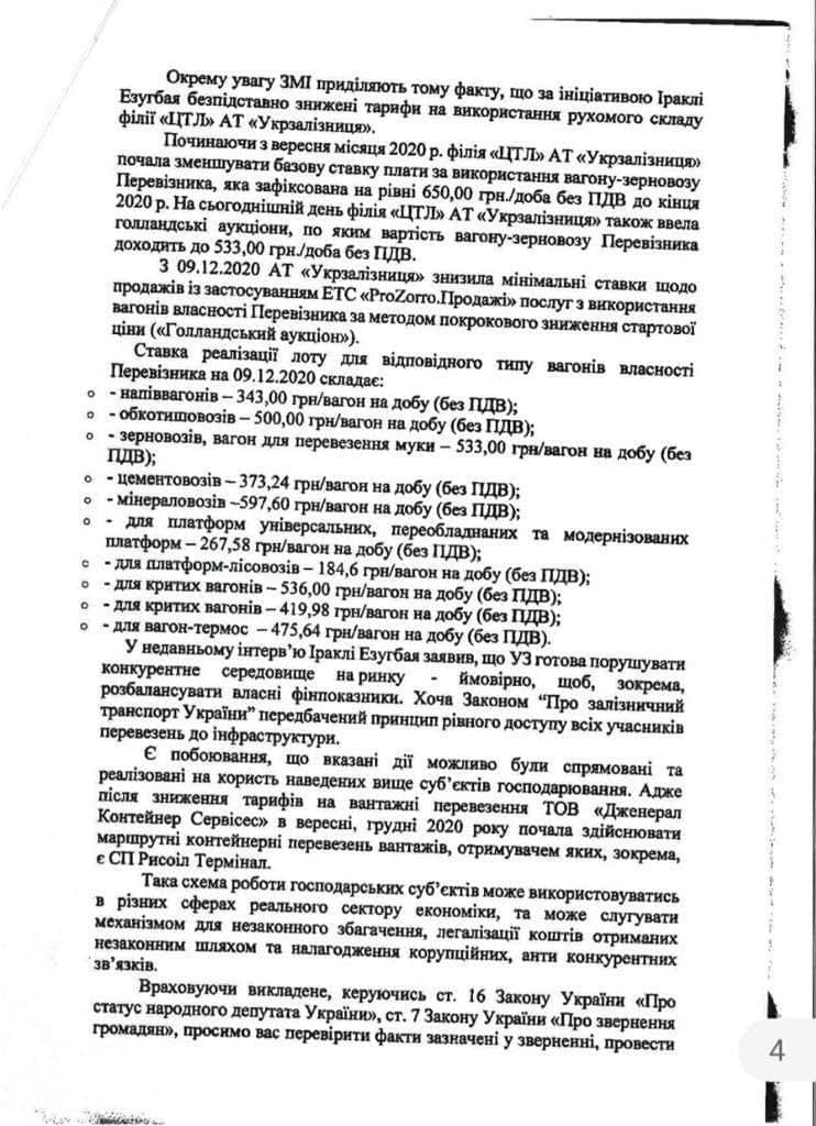 Народные депутаты указывают, что снижение цены происходит с 9 декабря с помощью использования, так называемых «голландских аукционов», а именно снижения стартовой цены. Так, последний месяц полувагоны предоставляются по цене 343 грн/сутки, обкатышевозы – 500 грн/сутки, зерновозы – 533 грн/сутки, цементовозы – 373 грн/сутки, минераловозы – 597 грн/сутки, универсальные платформы – 267 грн/вагон за сутки, плдатформы-лесовозы – 184,6 грн/вагон, крытые вагоны – 536 грн/вагон в сутки, вагоны-термосы – 475 грн/вагон в сутки (цены указаны без НДС), что на порядок ниже цен, утвержденных на 2020 год правительством.