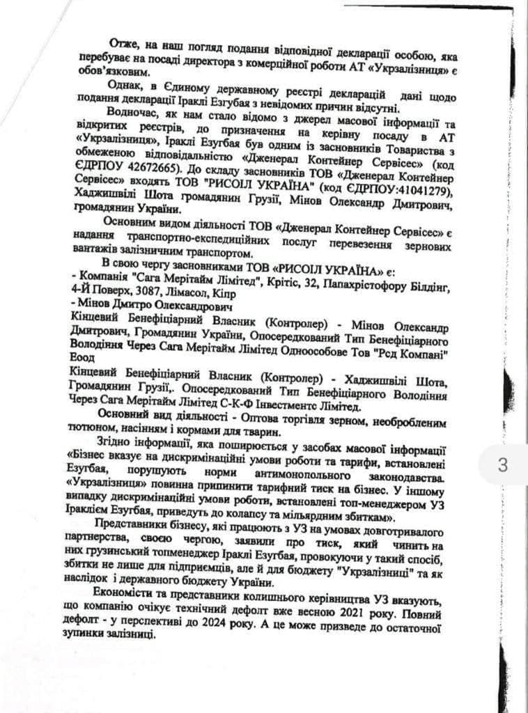 Нардепы просят Кабмин разобраться в возможных негативных последствия деятельности Эзгубая, ведь по оценкам экспертов, такая ценовая политика в 2021 году может привести к техническому дефолту «Укрзализныци», а в 2024 к остановке работы компании.