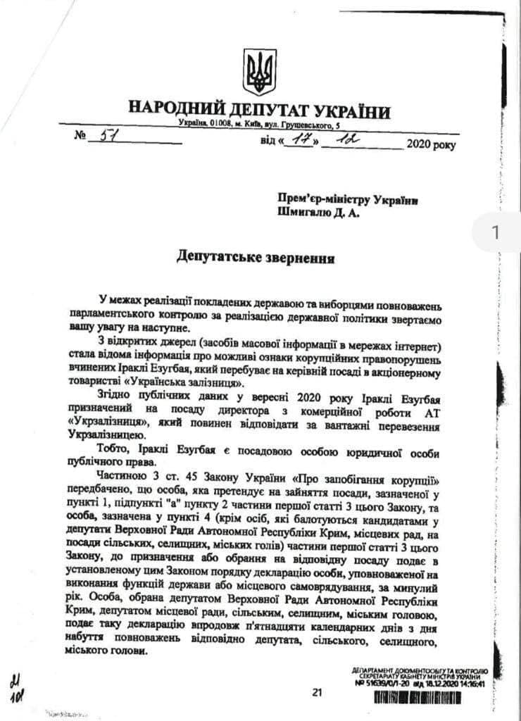Установление цен на грузоперевозки зависит непосредственно от новоназначенного коммерческого директора «Укрзализныци» Ираклия Эзгубая. По информации народных депутатов, при назначении на должность Эзгубай вопреки закону Украины «О предотвращении коррупции» не указал возможный конфликт интересов, поскольку является сооснователем компании, предоставляющей услуги ж/д перевозок «Дженерал Контейнер Сервисес».