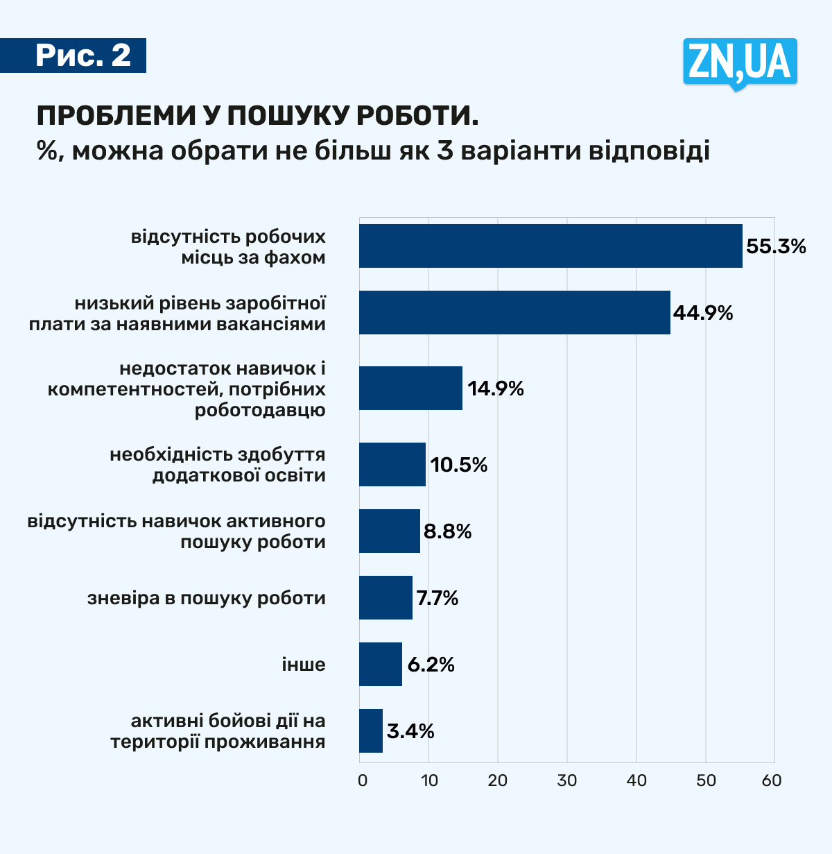Главными трудностями при поиске работы в Украине сейчас является отсутствие рабочих мест по специальности (об этом сообщили 55,3% опрошенных, в том числе 58,3% мужчин и 51,8% женщин), низкий уровень заработной платы по имеющимся вакансиям (44,9 %, 41,2 и 49,4% соответственно) и недостаточность квалификации по сравнению с требованиями работодателя (14,9%, 14,7 и 15,3% соответственно). И несмотря на это, настроенность на получение нового образования является низкой — готовы на это только 8,9% респондентов, в том числе 9,6% мужчин и 8,2% женщин.