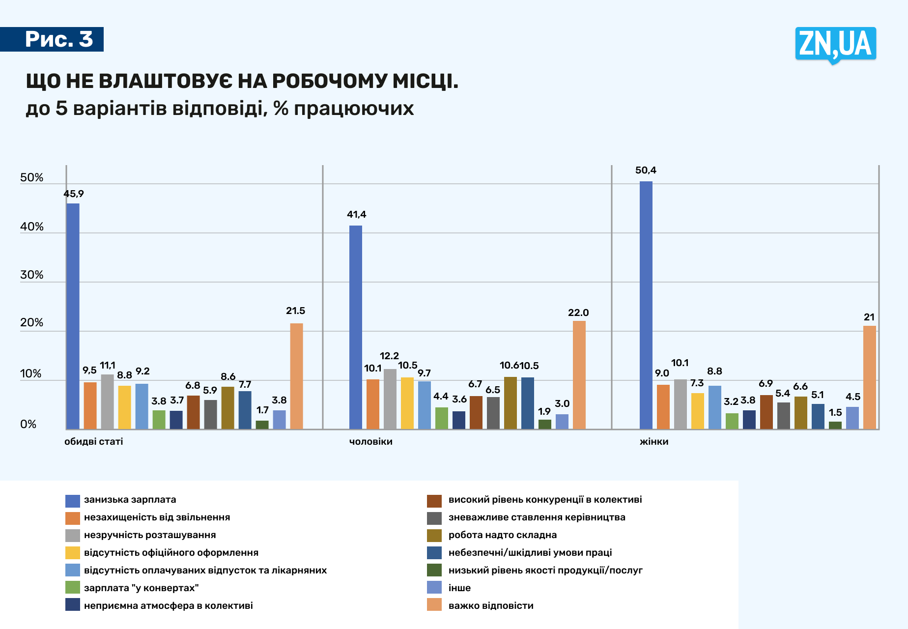 Именно слишком низкий уровень зарплаты больше не устраивает украинцев на рабочих местах (об этом сообщили 45,9% работающих, в том числе 41,4% мужчин и 50,4% женщин). Бросается в глаза практическое тождество масштабов неудовлетворения фактической зарплатой работающих и потенциальной — соискателей работы. И в обоих случаях больше недовольны заработками женщины. Они также меньше учитывают опасность условий труда, сложность работы и, вопреки ожиданиям, официальность или неофициальность оформления. Различия в неудовлетворении можно объяснить гендерной спецификой занятости: женщины значительно меньше работают в опасных/вредных условиях и чаще выполняют достаточно простые обязанности, получают значительно более низкую зарплату и потому вынуждены соглашаться на теневые условия, жертвуя одновременно собственной социальной защищенностью.