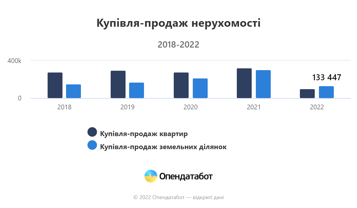 Похожая ситуация в 2022 году сложилась и с куплей-продажей земли. Количество проданных земельных участков уменьшилось в 2,3 раза в год. Нотариусы заверили 133447 таких соглашений.