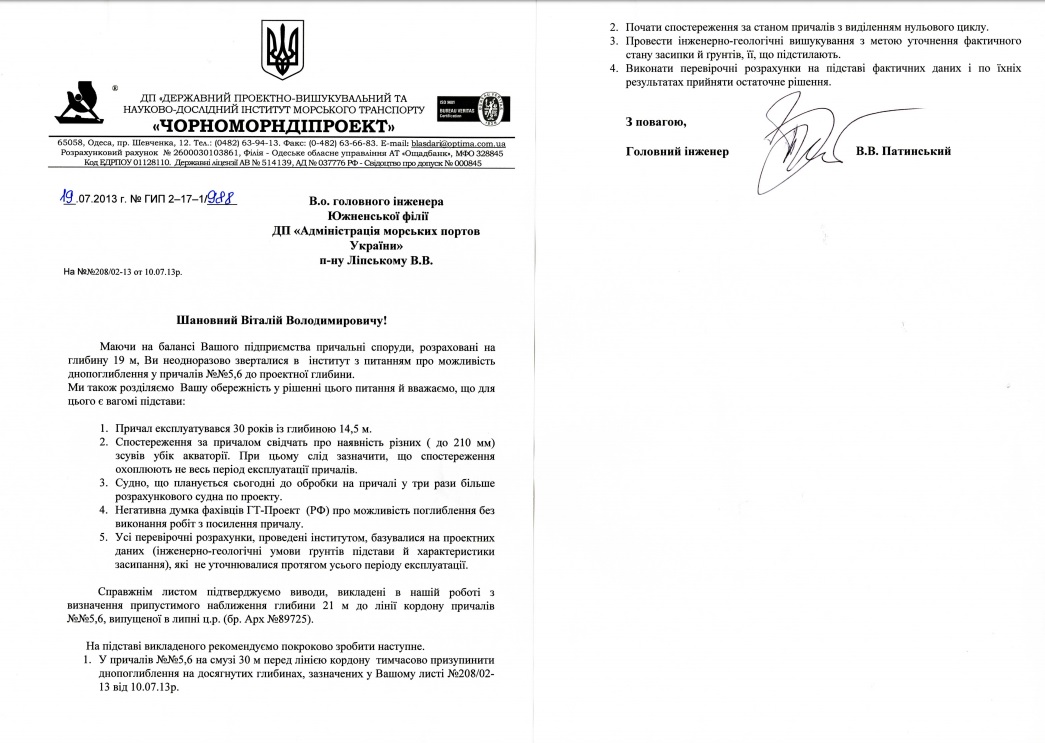 По расчетам "ЧЕРНОМОРНИИПРОЕКТ" также отметил, что у причала №5 допускается углубление до 17,0 м., у причала №6 - до 18,0 м. При этом глубина 21 м. вообще может быть достигнута не ближе 35 м. к линии кордона причалов. "Переборы по глубине не допускаются. Для оценки дальнейшего увеличения глубин необходимо выполнить комплекс инженерно-геологических изысканий и на их основе разработать проектное решение", - идет речь в поверочных расчетах НИИ №89725.