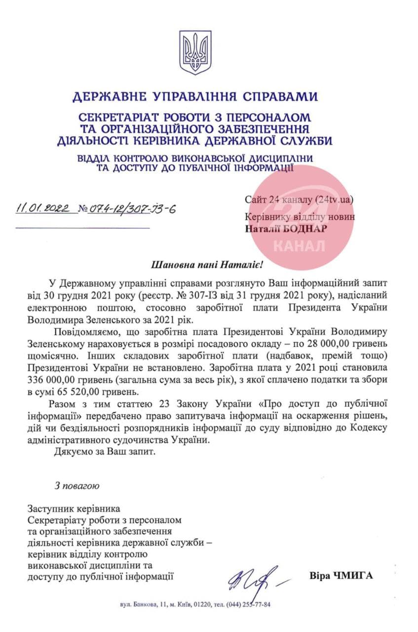 Согласно документу, должностной оклад Зеленского составлял 28 тысяч гривень. Кроме того, в прошлом году надбавки и премии он не получал.