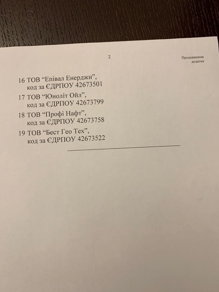 "Принято решение, относительно санкций, в контексте недрапользования, относительно компаний: "Геоконнект", "Глобал Геоинвест", "Транссетгео", "Геопост", "Геовертикаль", "Геотаргет", "Надрапрайд", "Геофорс", "Геостенс", "Надравестгруп", "Бэст ойл компании", "Надрапростир", "Инфогеотренд", "Эйджин марка, "Экогазальянс", "Эпивал энерджи", "Юнолит Ойл", "Профиннафт", "Бэстгеотек". Относительно этих 19 компаний применен максимальный вид санкций, которые может применить наша страна, применить Совет национальной безопасности и обороны нашей страны", - отметил Данилов.