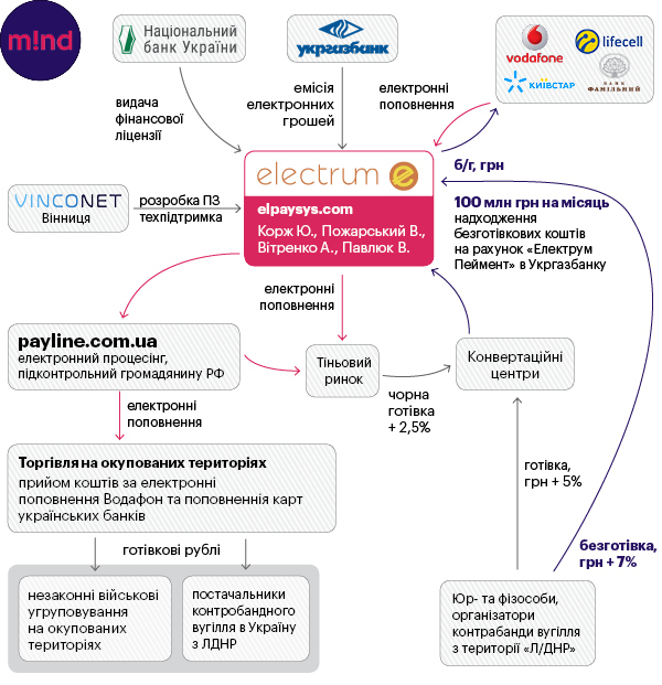 К этой схеме, по версии следствия, причастна и "Электрум пеймент систем", поскольку трансакции между территорией Украины и ДНР/ЛНР осуществляются с помощью электронных денег "Электрум". Основные финансовые потоки на оккупированные территории предназначаются для оплаты за ввезенный контрабандой уголь и непосредственно на финансирование незаконных вооруженных формирований с территории Украины.